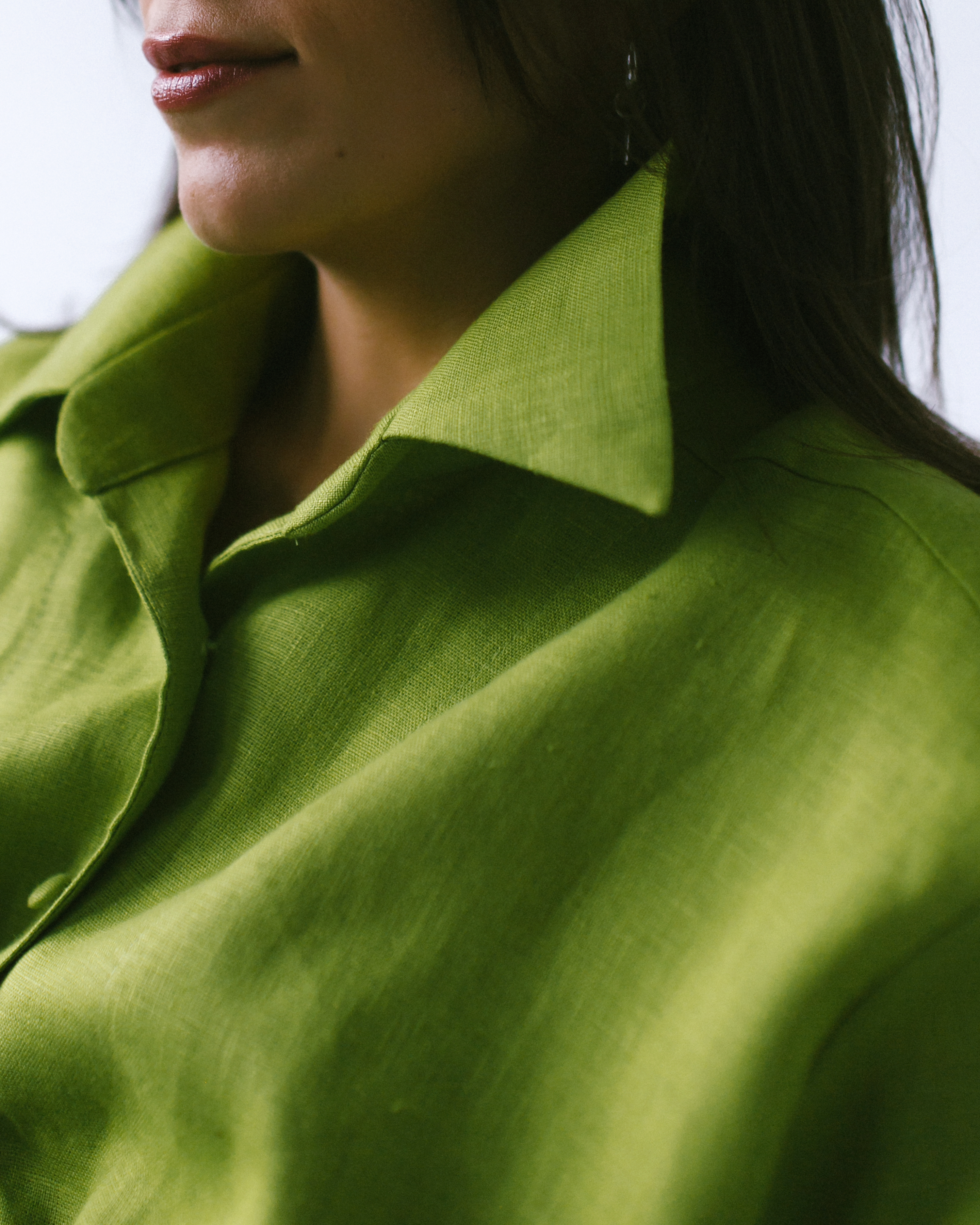 Рубашка из льняной ткани с длинным рукавом. Воротник рубашечный, на притачной стойке. Спинка со встречной складкой и отрезной двойной кокеткой, переходящей на полочку. В подгибку по низу спинки частично вставлена широкая резинка. Линия проймы спущена, рукав заужен к низу. По низу рукава разрез обработан косой бейкой. Притачная широкая манжета на рукаве с застежкой на 1 пуговицу. Борта полочек обработаны подбортами и застегиваются на 3 пуговицы. На полочках – цельнокроеные завязки.