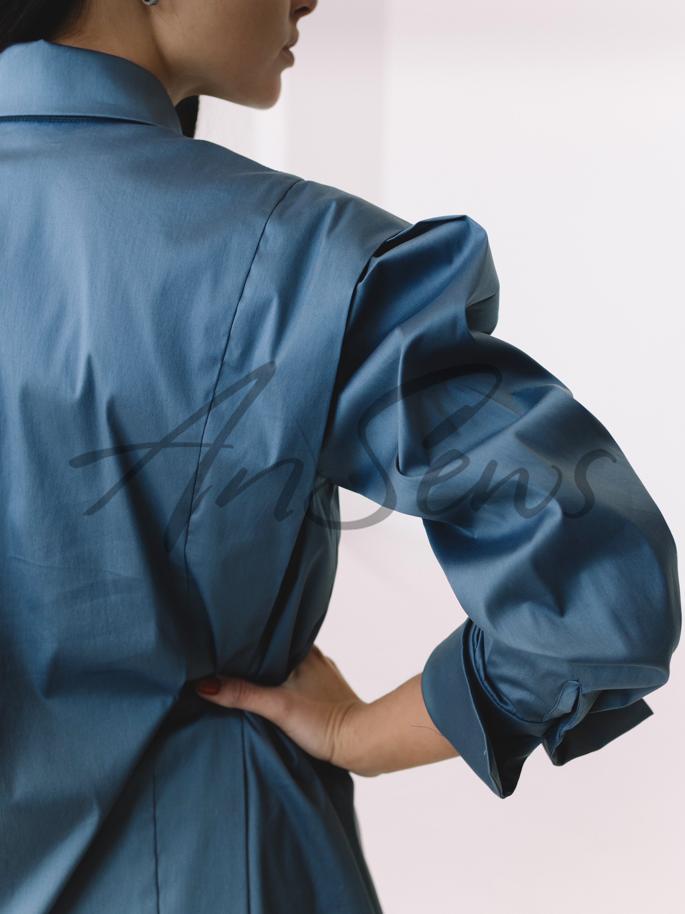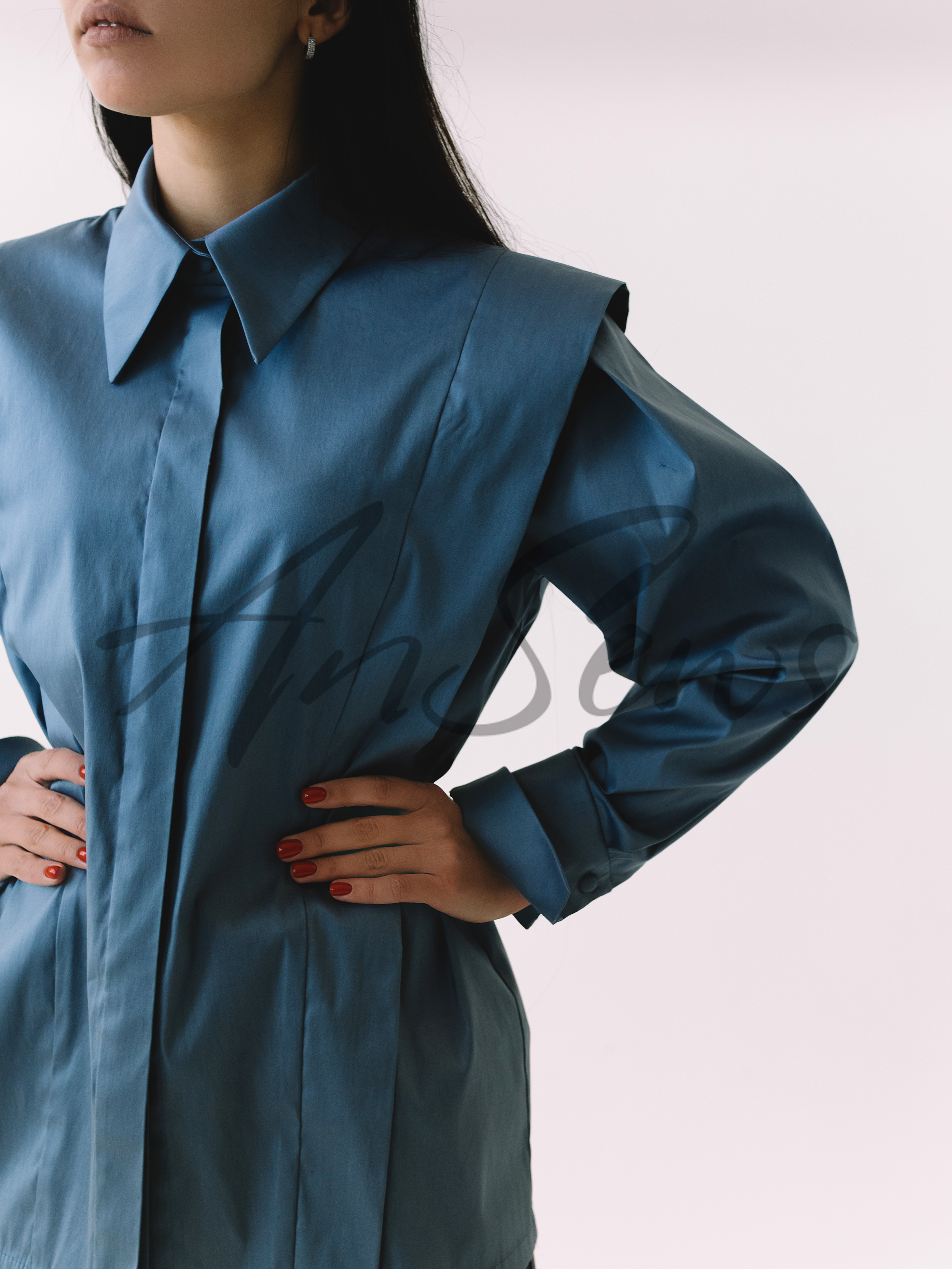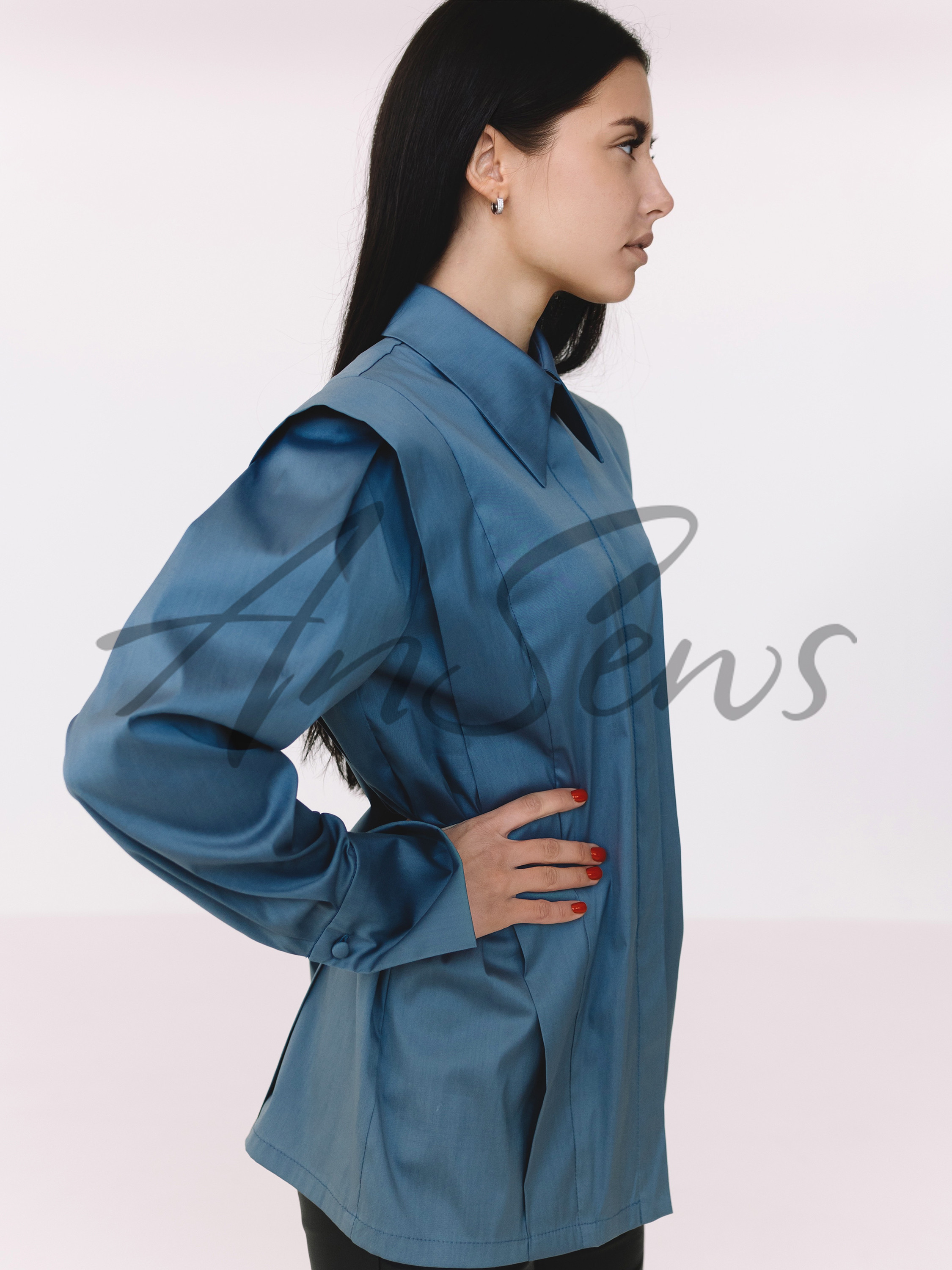 Рубашка прямого силуэта свободного объема. Супатная застежка на пуговицы. Воротник рубашечный, классический с отрезной стойкой. В рельефных швах спереди и на спинке вшиты «крылышки». Рукав втачной, с двумя глубокими складками по окату. Манжеты широкие, с застежкой на одну пуговицу.