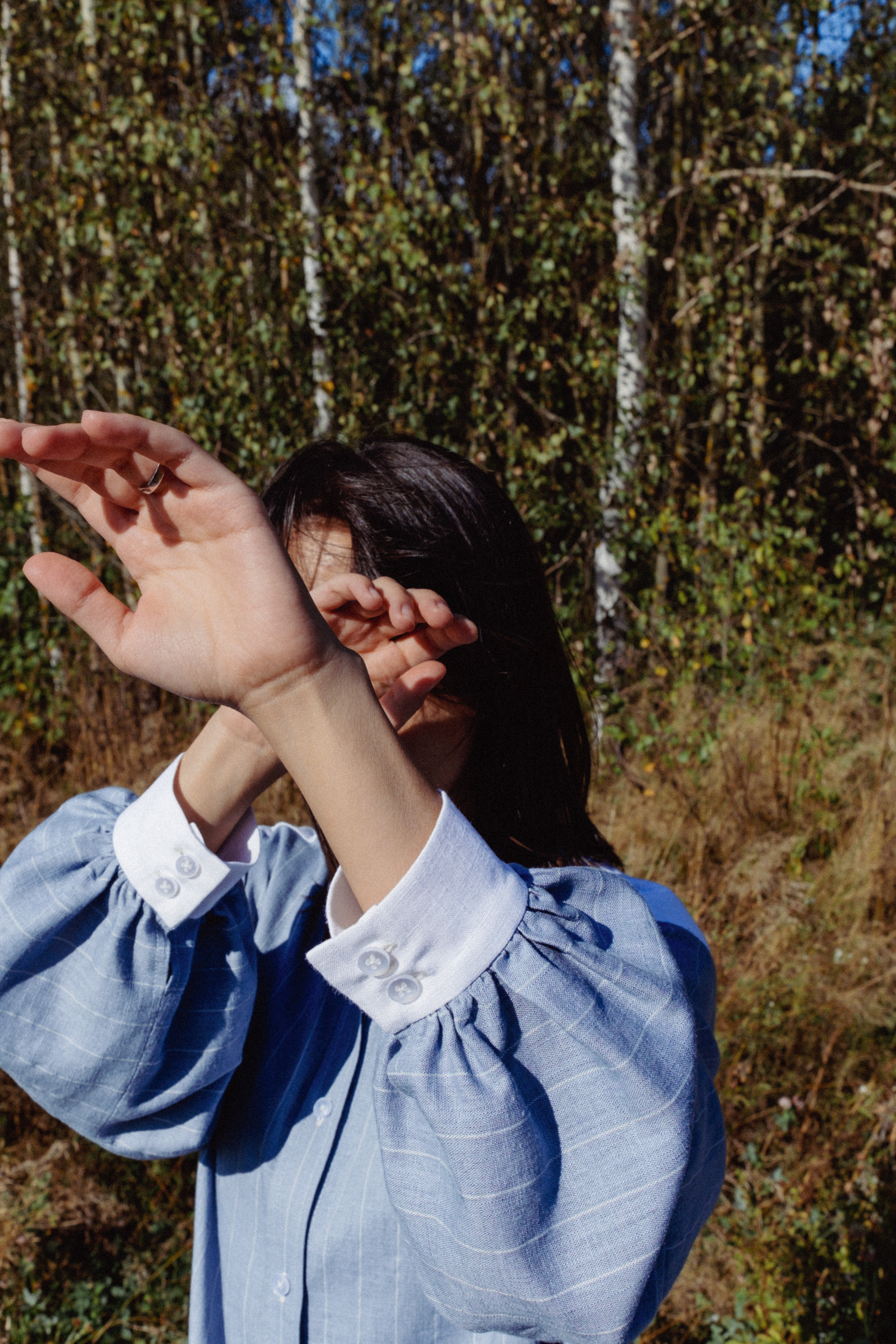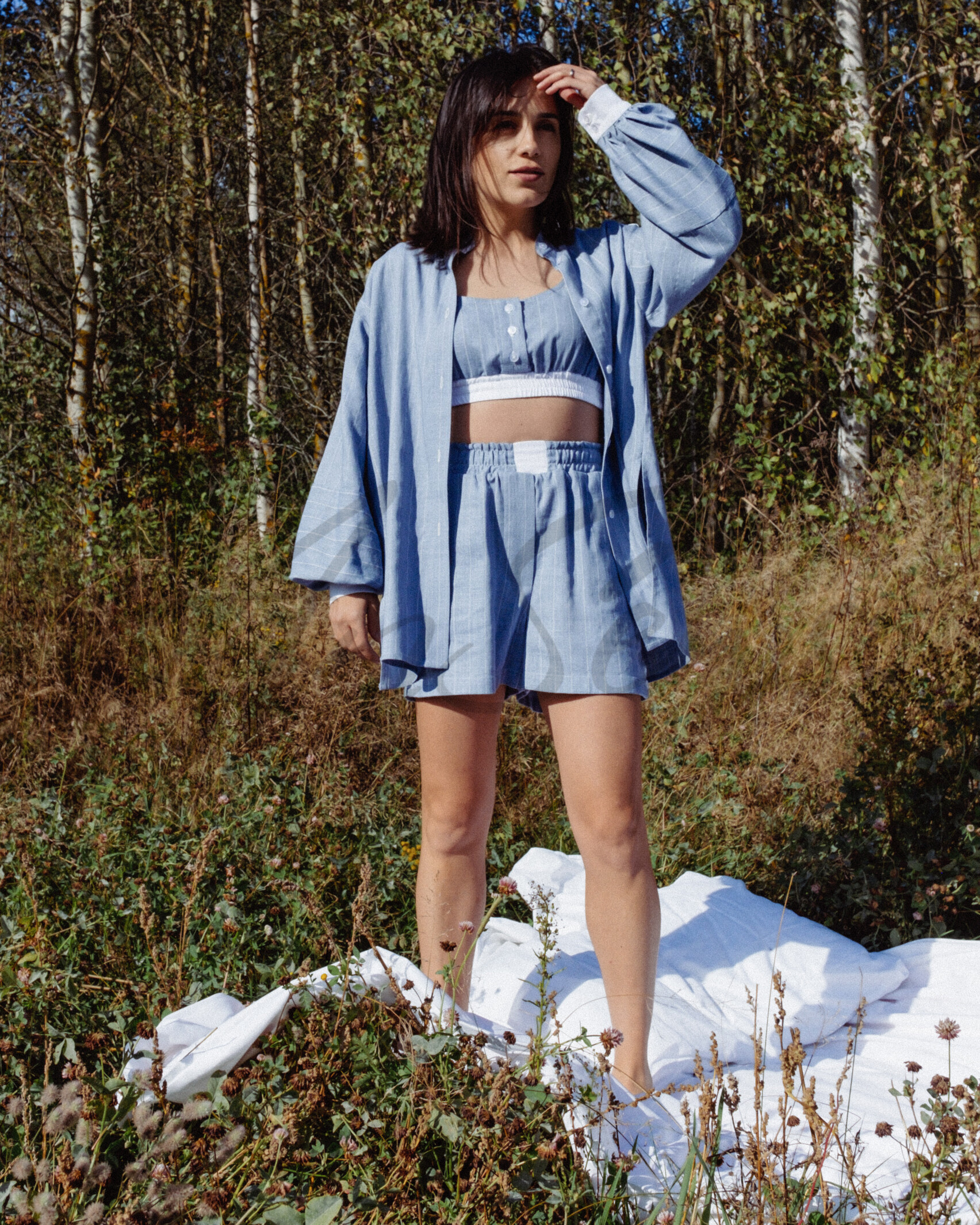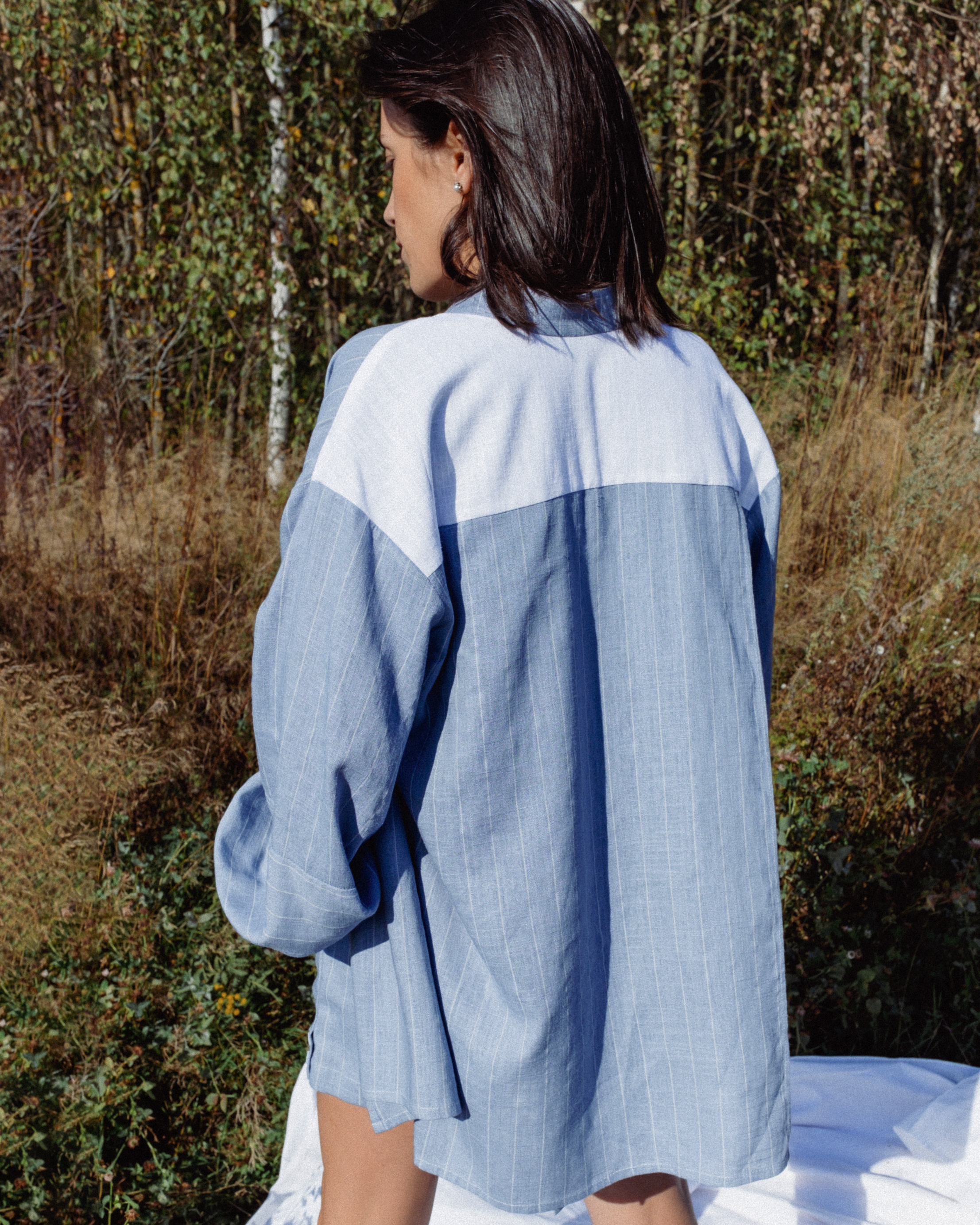 Рубашка объёмной свободной формы длиной ниже бёдер из полульняной ткани. Спущенная линия плеча, заниженная пройма. Воротник – отрезная стойка застёгивается на пуговицу. Полочки с застёжкой на 5пуговиц. Спинка из двух частей, соединённых внахлёст друг на друга. Спинка на двойной кокетке, верхняя кокетка из ткани-компаньона. В боковых швах – разрезы. Рубашечный рукав из двух частей. В нижней части рукав расширяется и собирается мягкими складками на манжету из ткани-компаньона. Манжеты застёгиваются на 2 пуговицы.