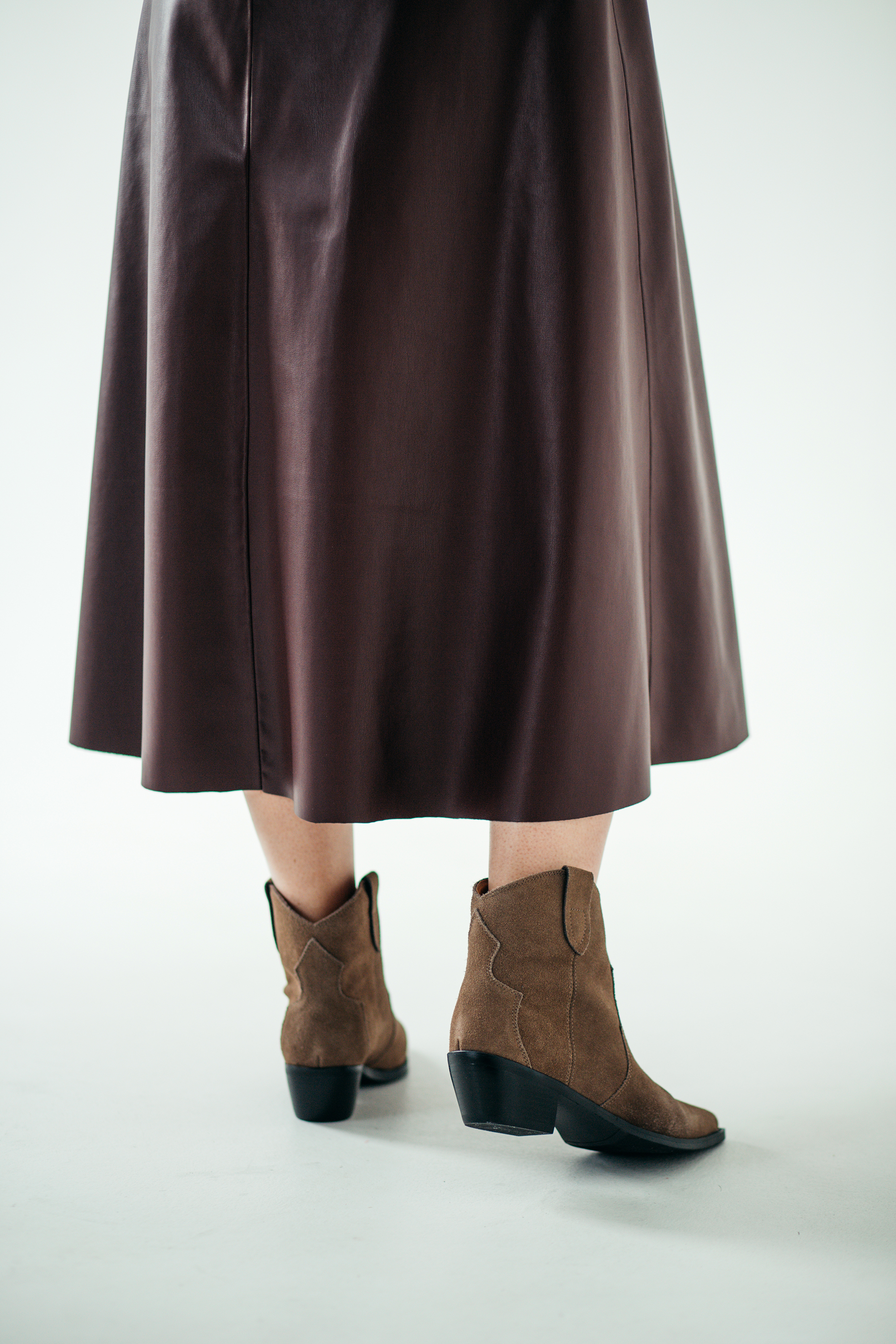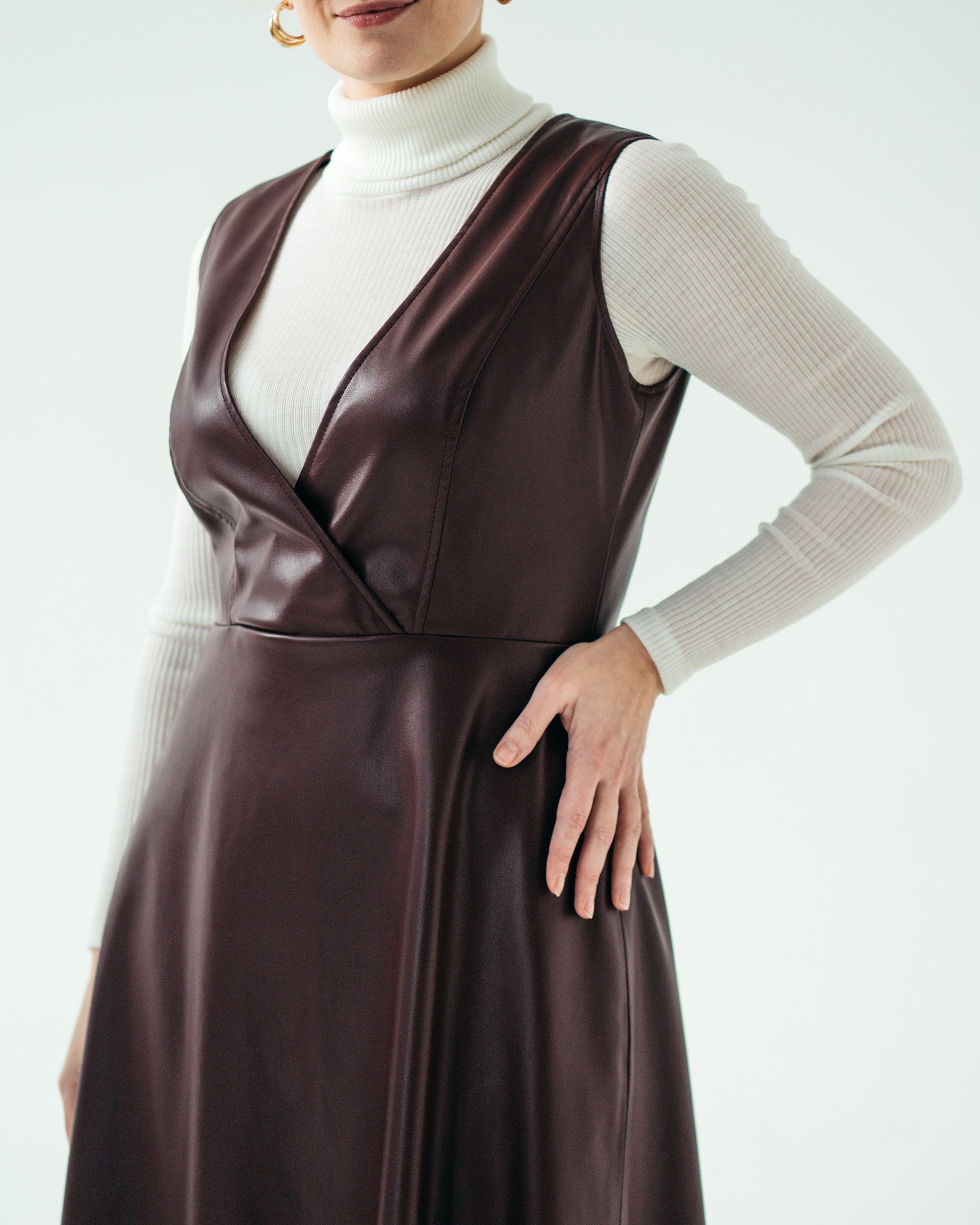 Сарафан из искусственной кожи прилегающего силуэта длиной до середины икры, отрезной по линии талии. Прилегающий лиф с рельефами, глубоким вырезом на запАх. Юбка А-силуэта. Спинка лифа приталена вытачками, отстроченными отделочными строчками. Застёжка – молния в среднем шве спинки. Отделочные строчки по горловине и проймам. Сарафан полностью на подкладке.