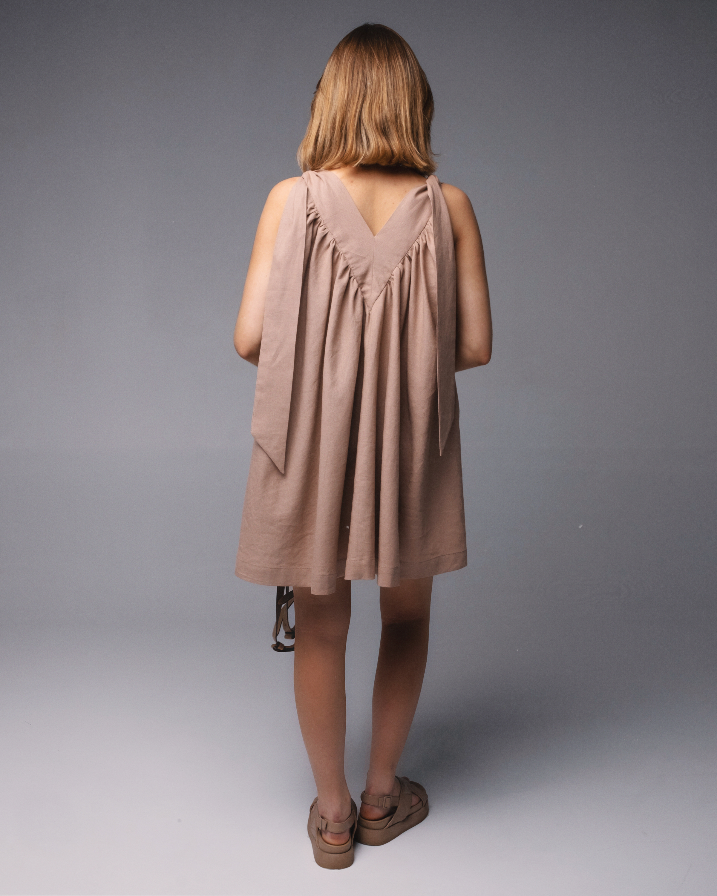 Сарафан большого объема, А-силуэта. Вырез V-образный. Кокетки на спинке и переде переходят в широкие бретели, завязывающиеся на плечах. Карманы в боковых швах.
