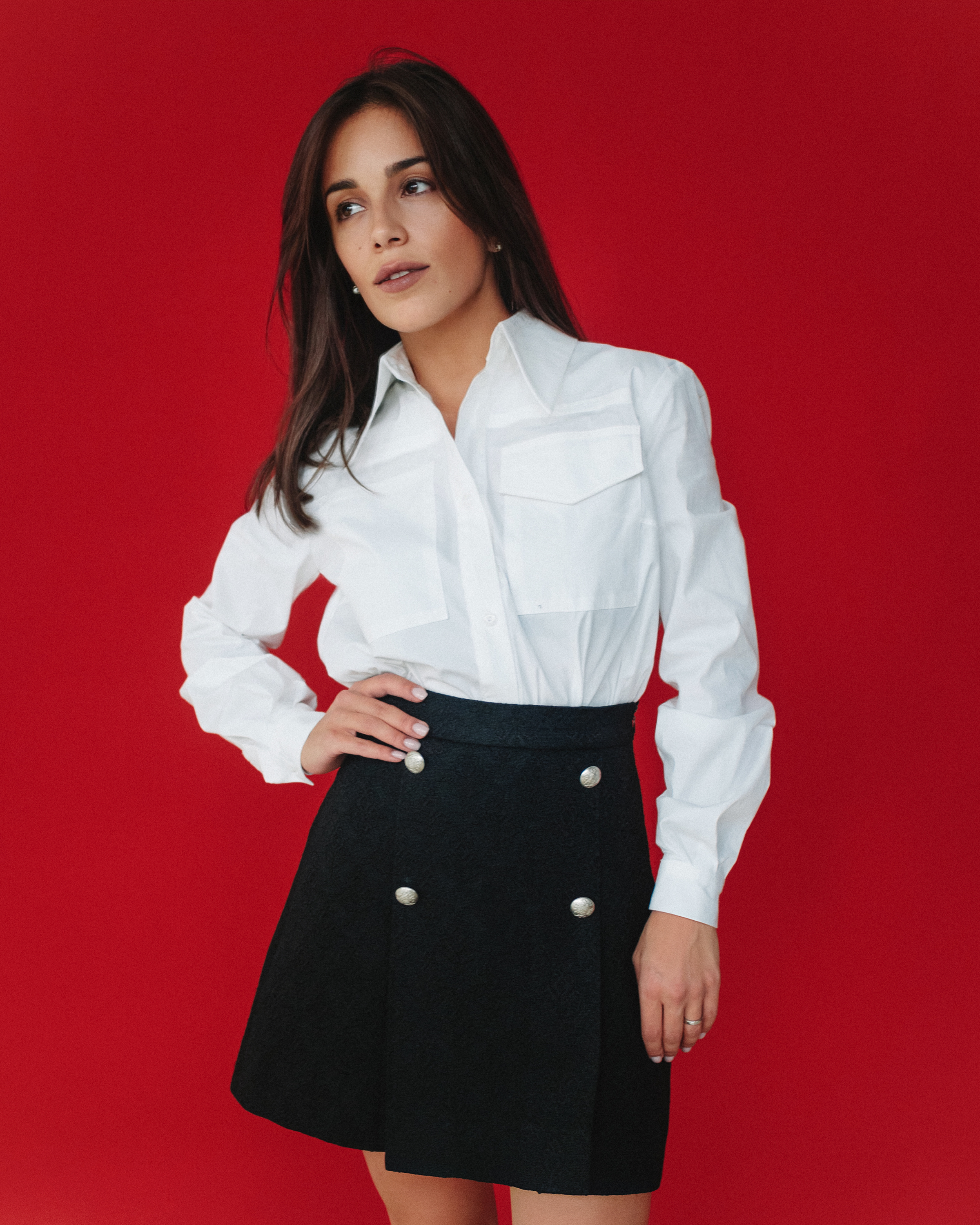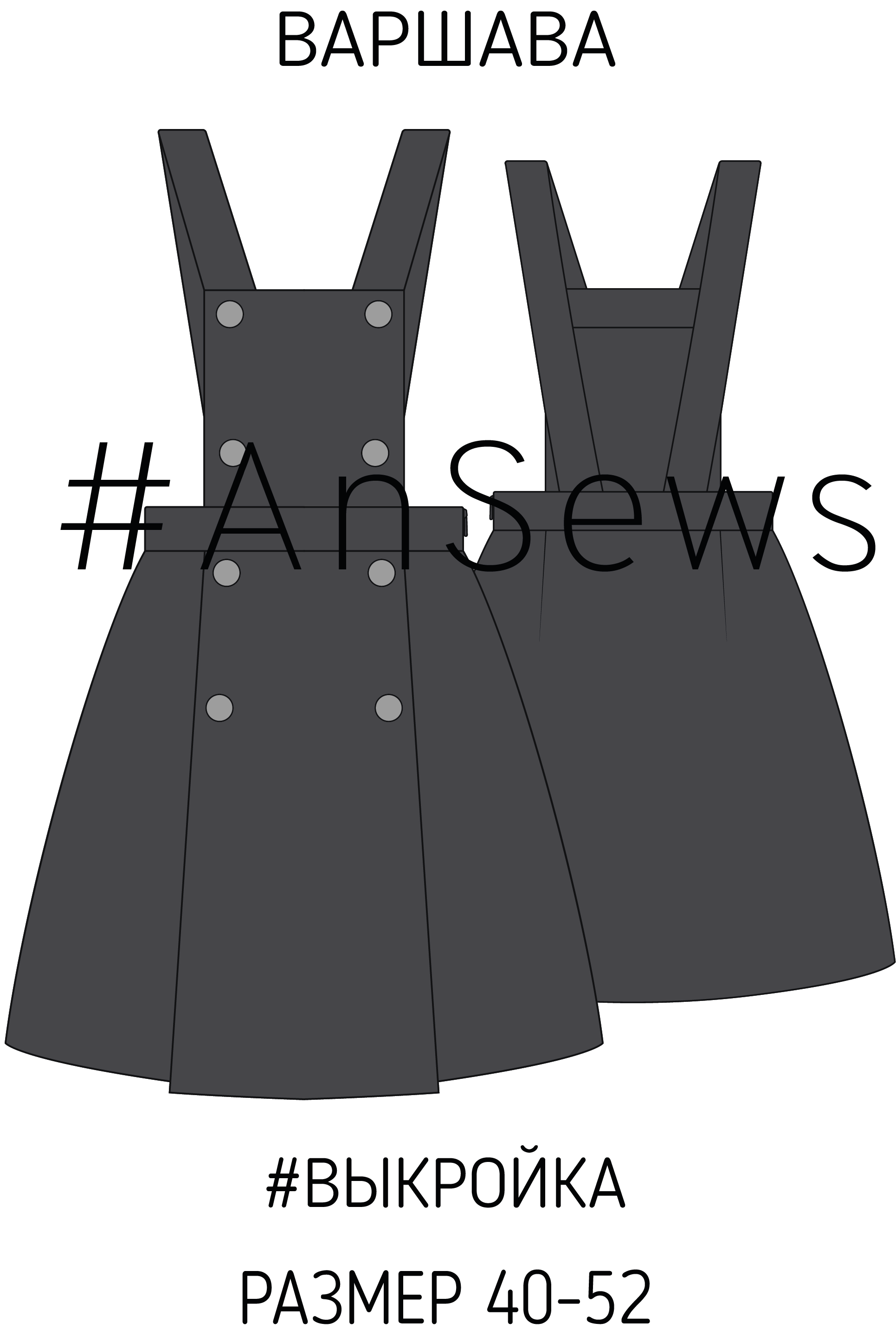 Сарафан на основе юбки А-силуэта с пристегивающейся верхней частью с бретелями. Низ сарафана представляет собой слегка расклешенную юбку на притачном поясе, на подкладке. Спереди на юбке выполнены две глубокие складки, застроченные до линии бедер, сзади – вытачки. Застегивается юбка на потайную молнию в левом боковом шве. Верхняя часть сарафана пристегивается на плоские пуговицы к поясу юбки и представляет собой прямоугольник со втачанными бретелями. На спинке бретели соединяются перемычкой на уровне лопаток. Спереди на сарафане пришиты 8 декоративных пуговиц. В комплект лекал входят детали кроя из основной и подкладочной ткани.