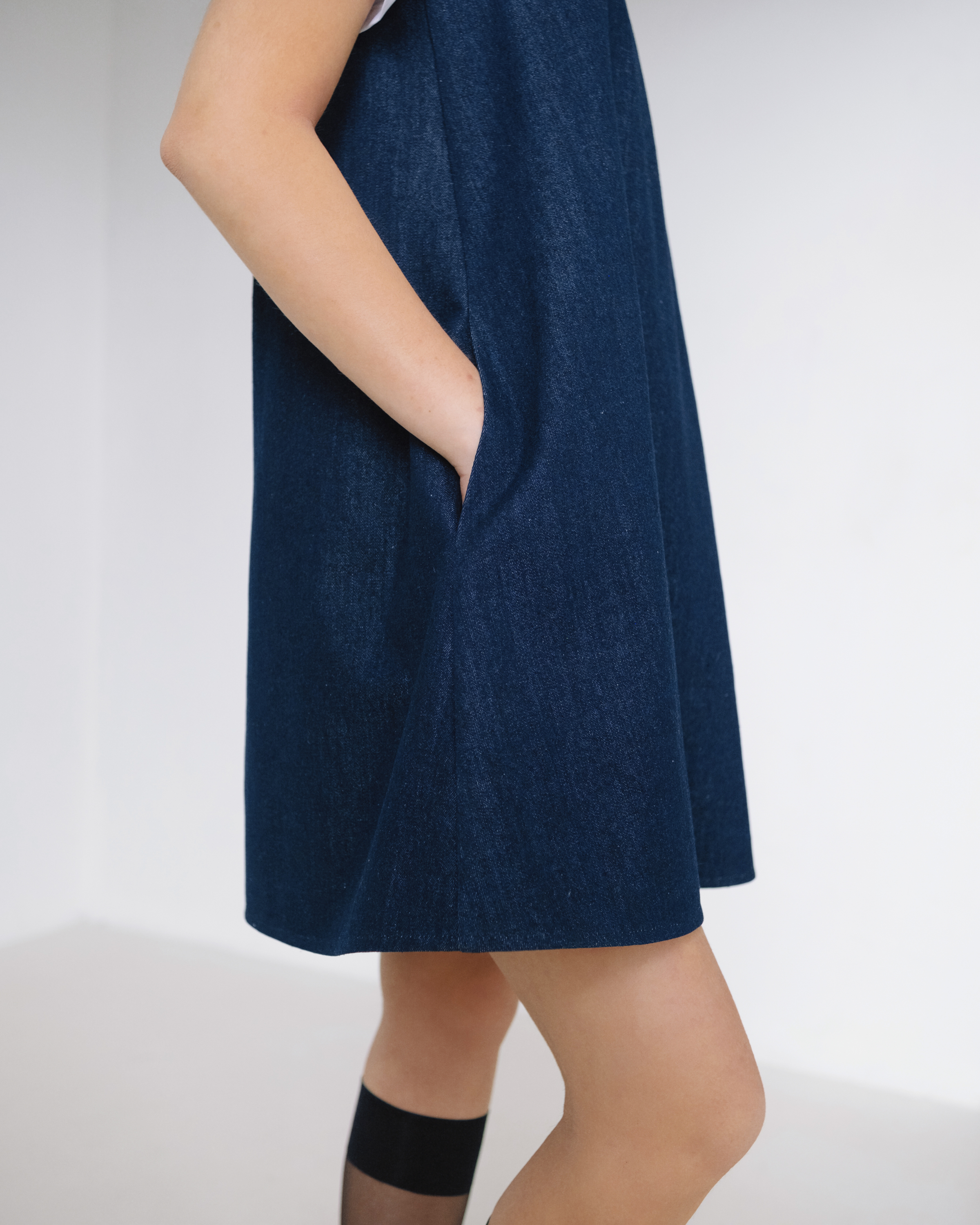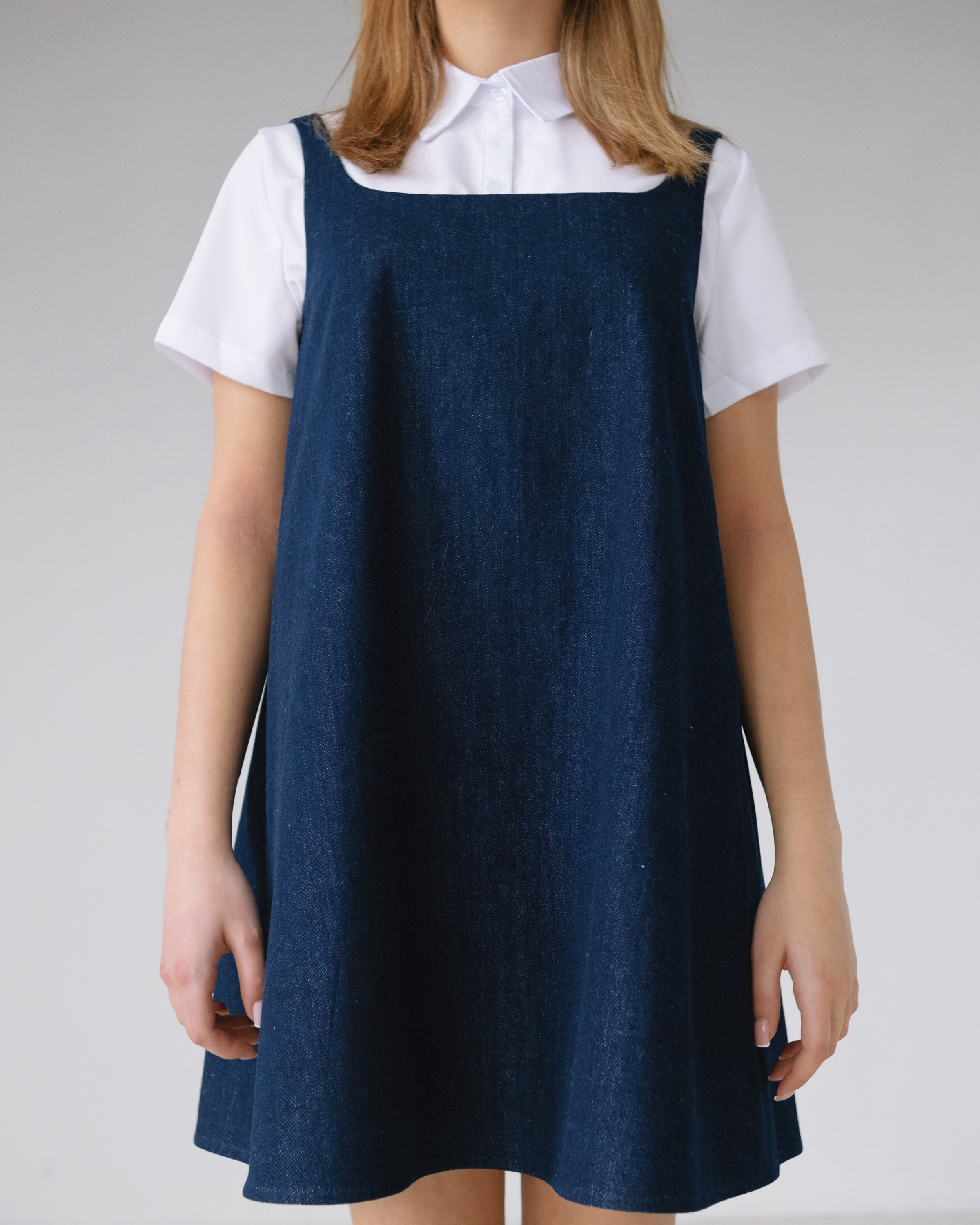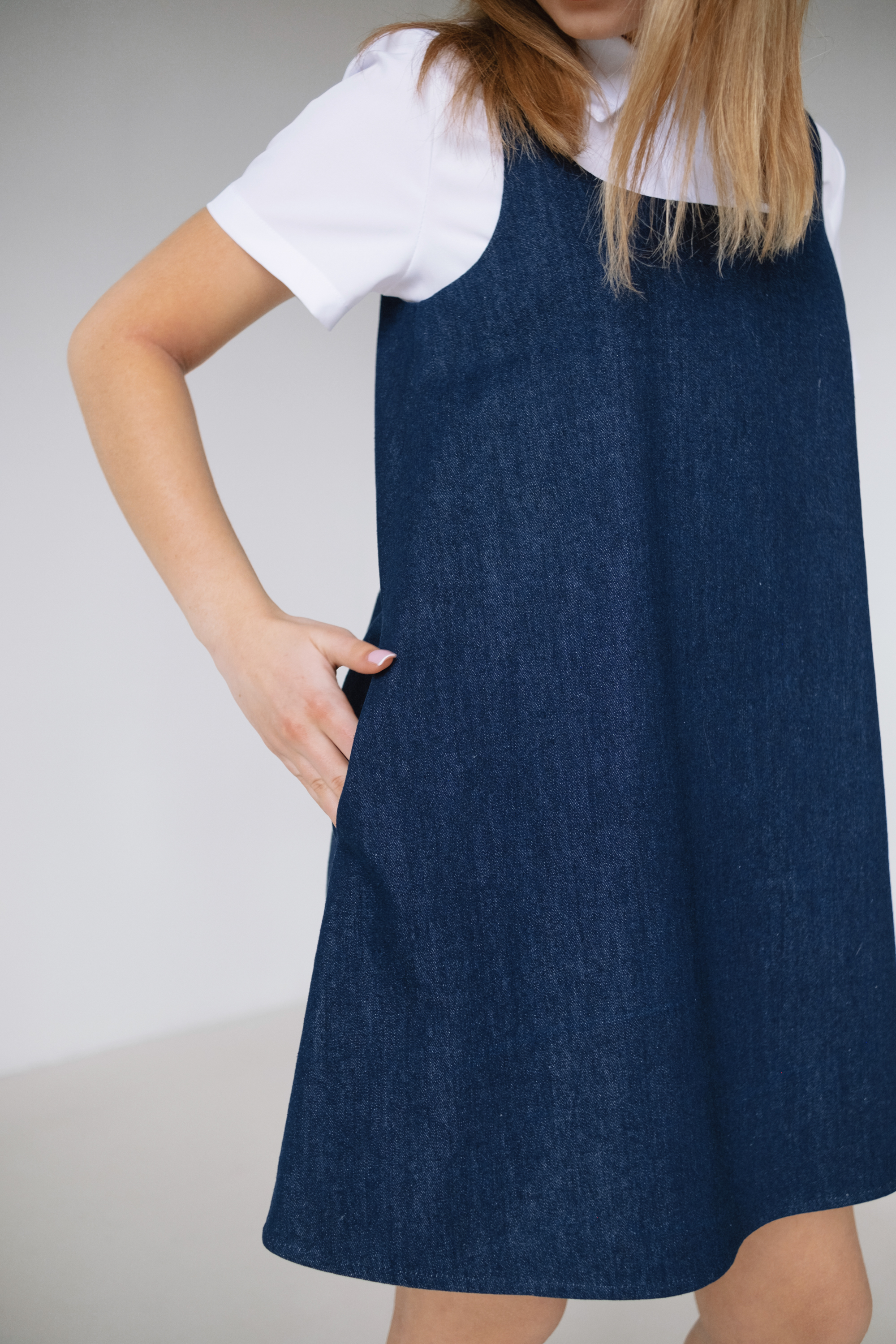 Сарафан умеренного объема А-силуэта из джинсовой ткани. Узкие цельнокроеные бретели обработаны обтачками. Потайная молния в среднем шве спинки. Карманы в боковых швах.