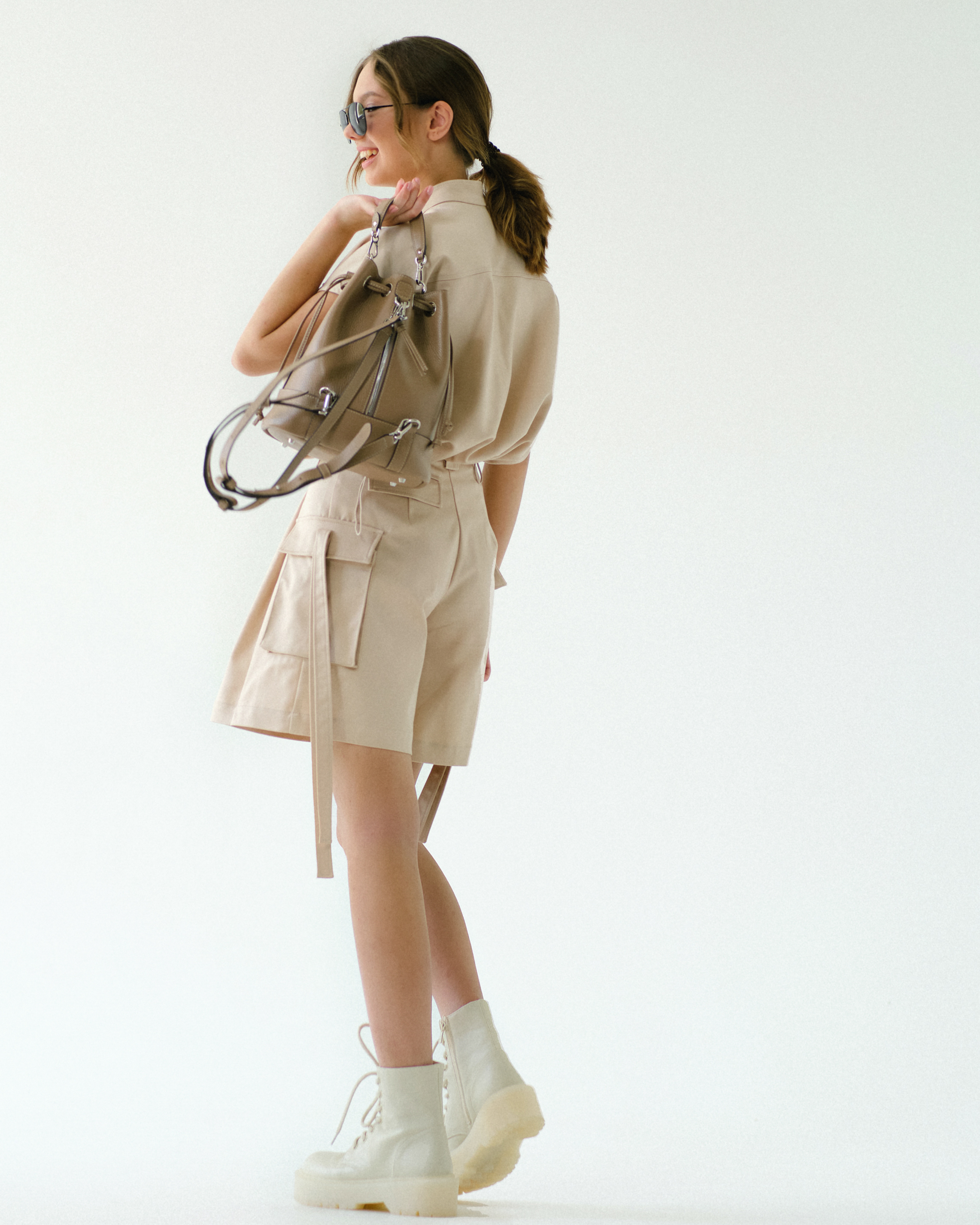Шорты в стиле сафари длиной до середины бедра из атласного костюмного тенселя с эластаном. Притачной пояс на естественной линии талии застёгивается на кнопку. На поясе три широкие шлёвки под ремень. Съёмный ремень из основной ткани с застёжкой «фастекс». Застёжка-молния спереди в среднем шве оформлена гульфиком. Спереди глубокие складки, придают объём и расклешение шортам. С боковых сторон накладные карманы-портфели с клапаном и декоративными длинными ремешками. Сзади вытачки, на левой половинке декоративный прорезной карман в рамку с клапаном. По клапанам карманов, шлёвкам на поясе, по съёмному ремню и ремешкам на карманах проложены отделочные строчки на расстоянии 0,5 см от края.