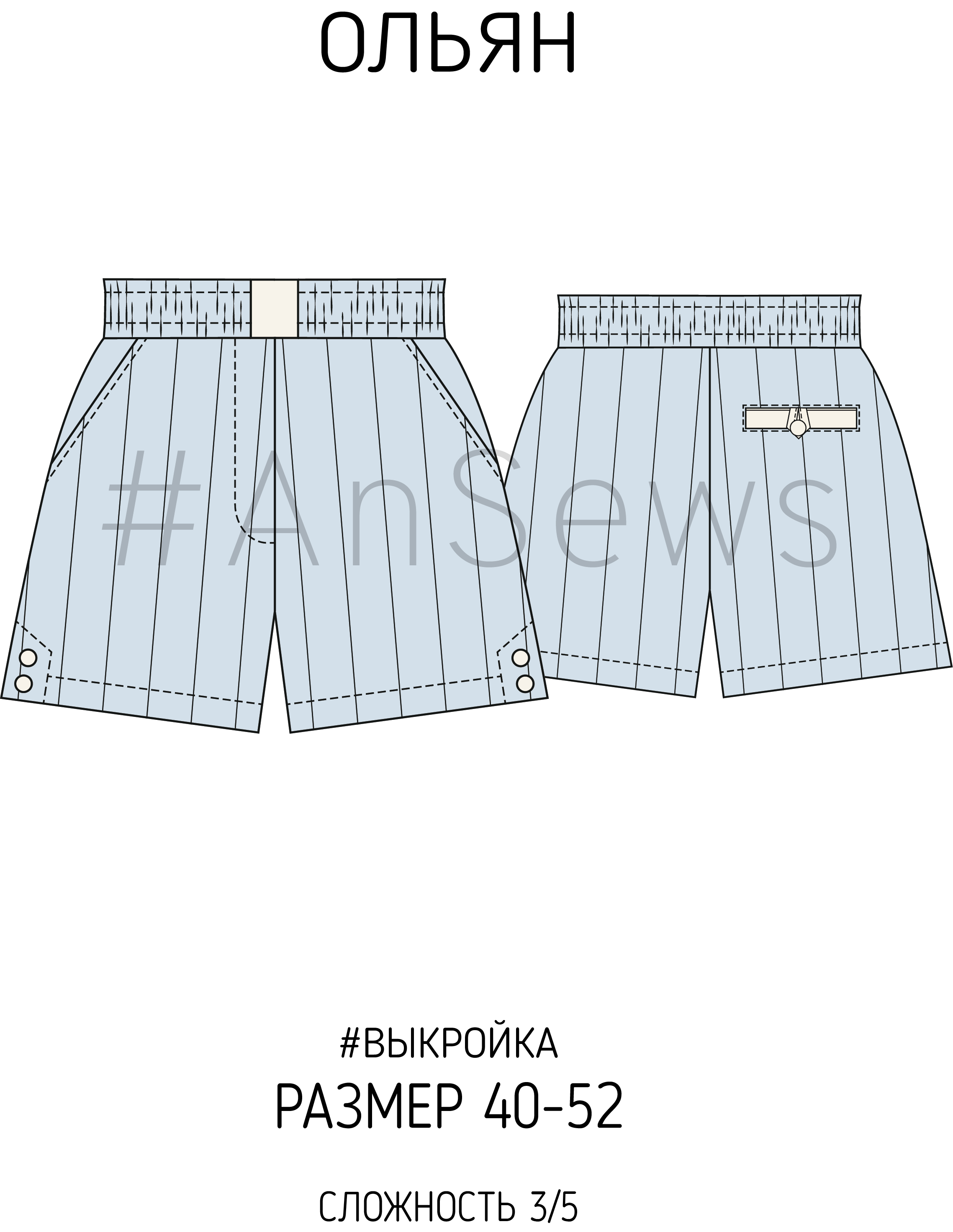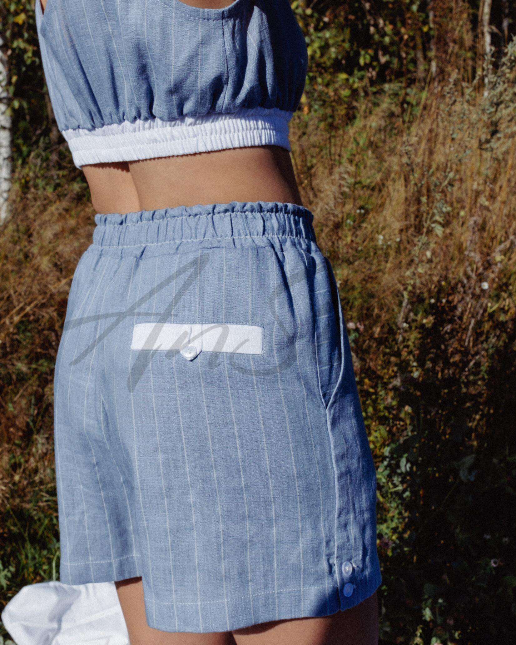 Шорты свободной формы длиной до середины бедра из полульняной ткани. Карманы с бочком на передних половинках шорт. В боковых швах по низу открытая шлица, застёгивается на 2 пуговицы. Сзади на правой половинке шорт имитация кармана с листочкой из ткани – компаньона, с навесной петлёй и пуговицей. Пояс притачной на резинке, простроченной двумя строчками. Спереди на поясе декоративная вставка из ткани – компаньона. В среднем шве передних половинок имитация гульфика.