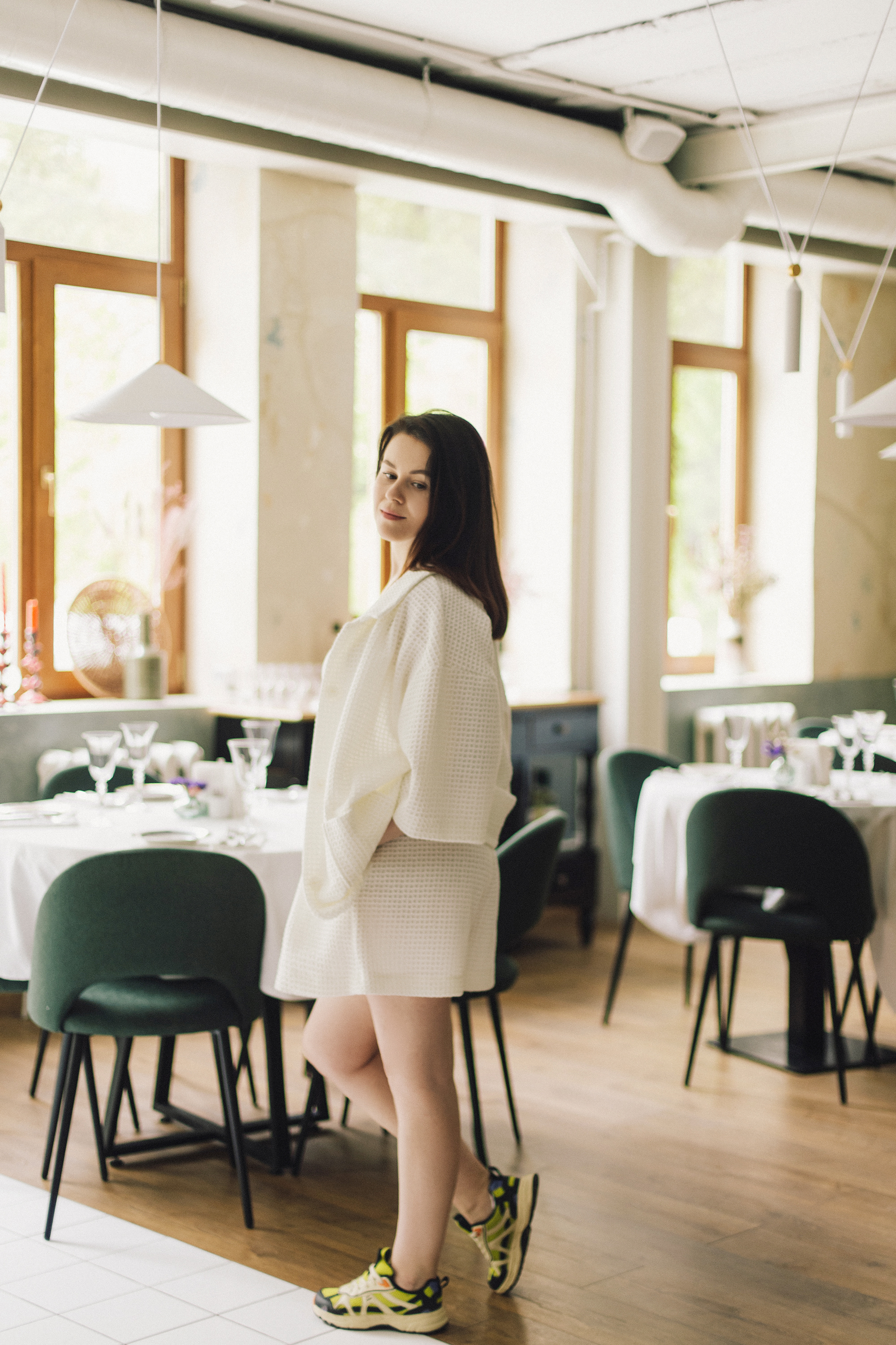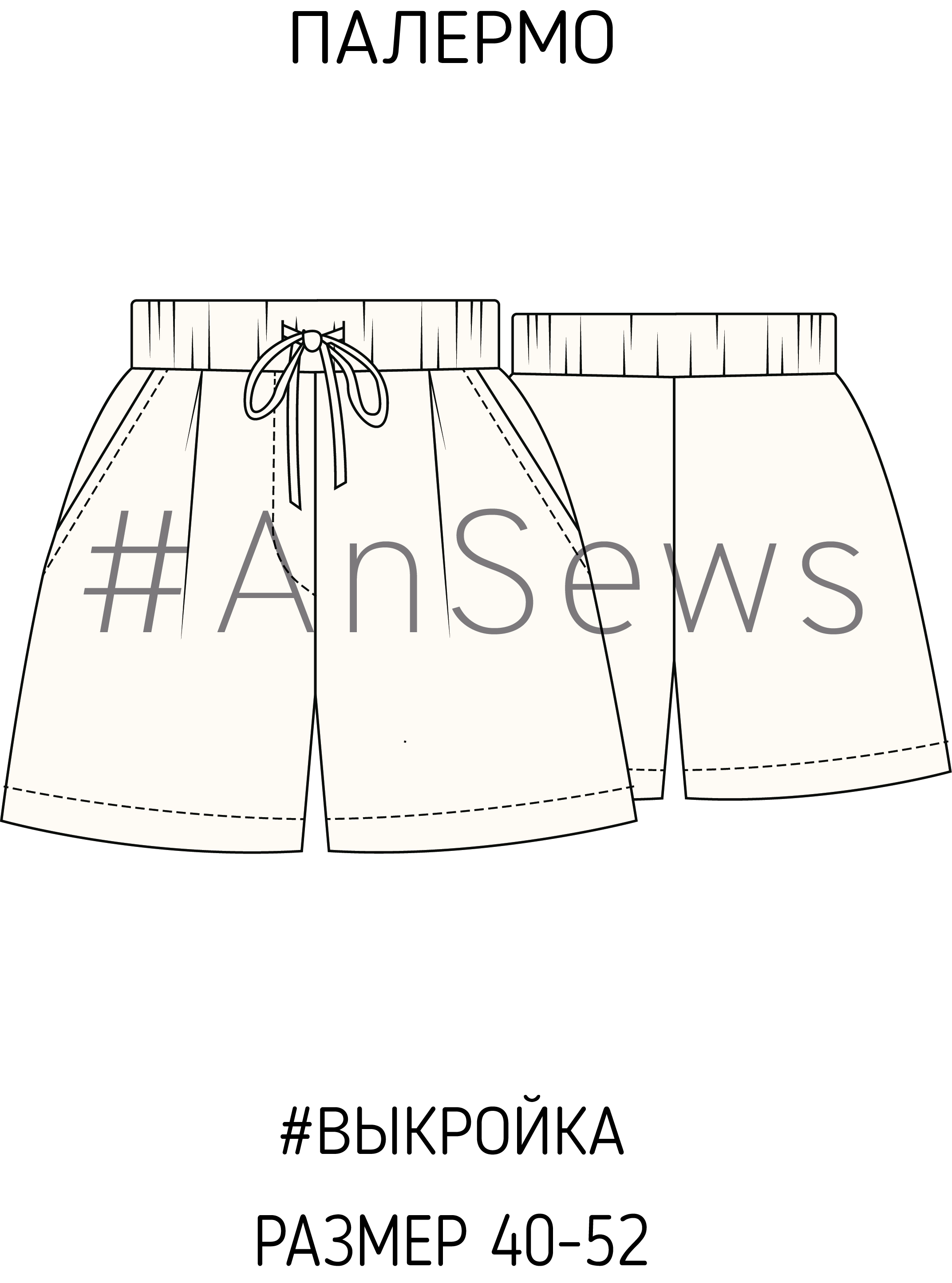 Широкие расклешенные шорты из трикотажного полотна с выработкой «вафля». Пояс притачной, с резинкой. Карманы с подкройным бочком. На передних половинках расположены защипы. Спереди выполнен ложный гульфик. На поясе пришит декоративный шнурок.