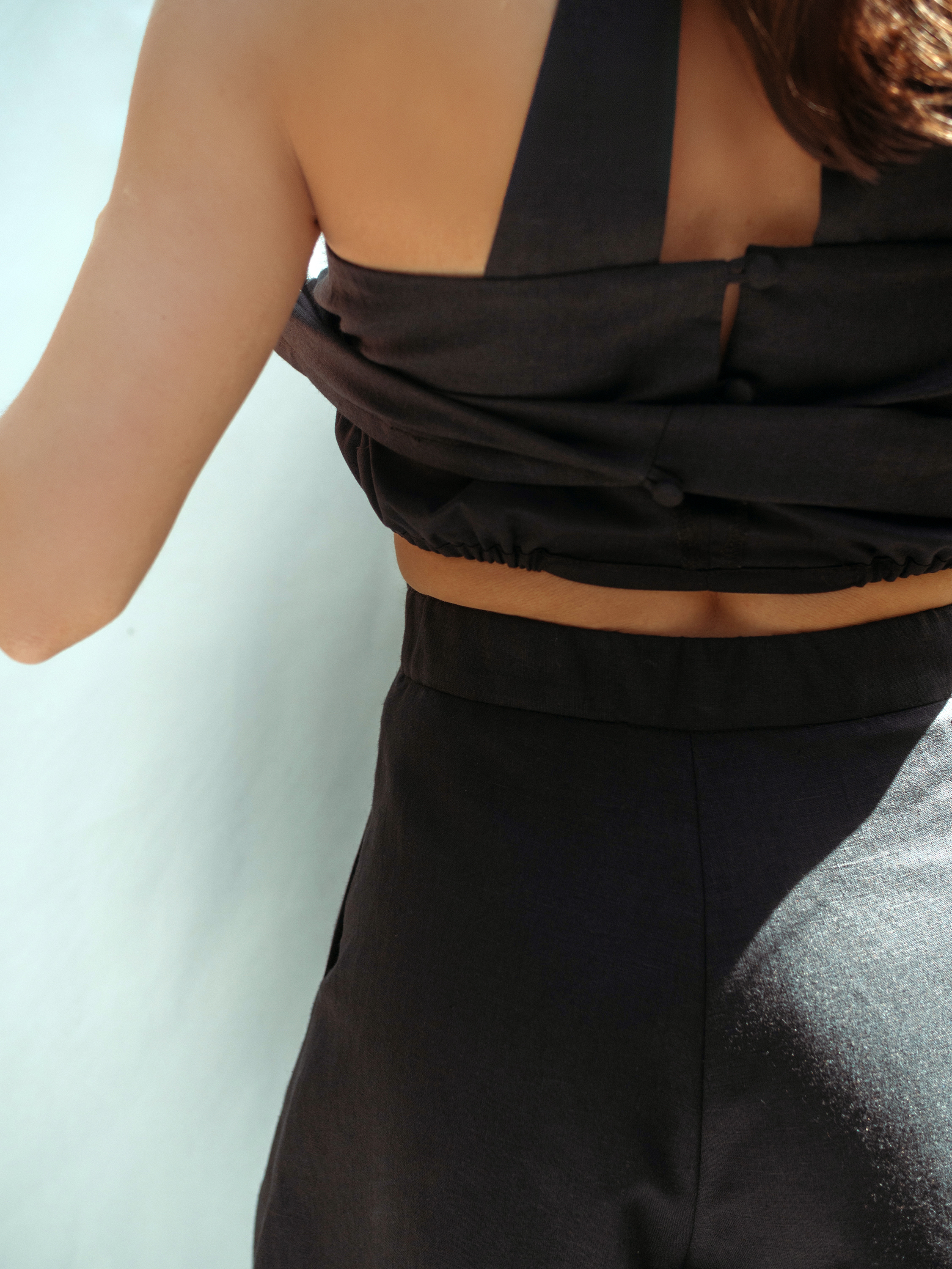 Топ слегка расклешенного силуэта с американской проймой и воротником стойкой. Спереди расположены вытачки из проймы. На спинке – 2 вертикальные бретели. Застежка на воротнике и спинке на навесные петли и пуговицы. Внутренняя часть топа выполнена укороченной, заканчивается под грудью кулиской на резинке.