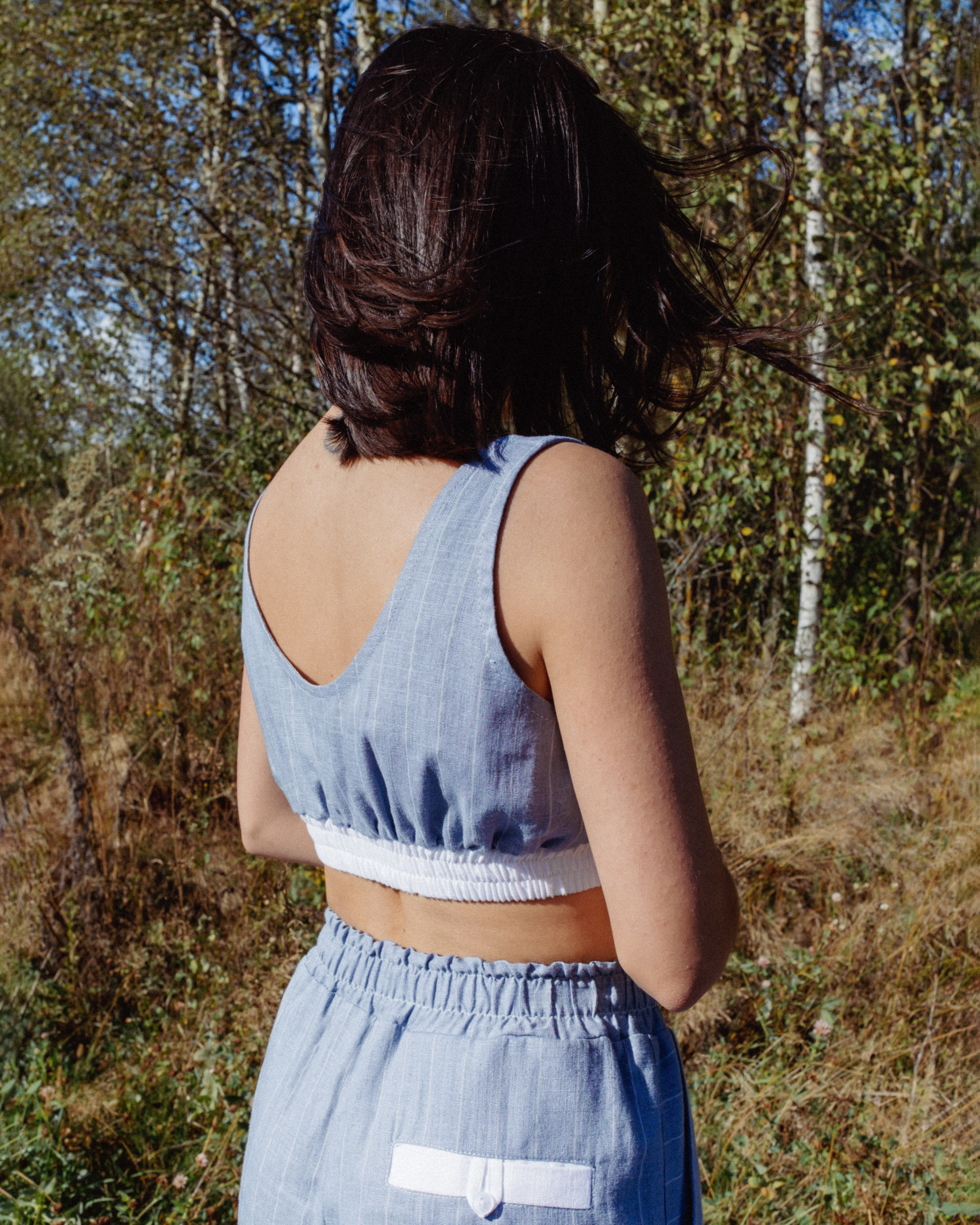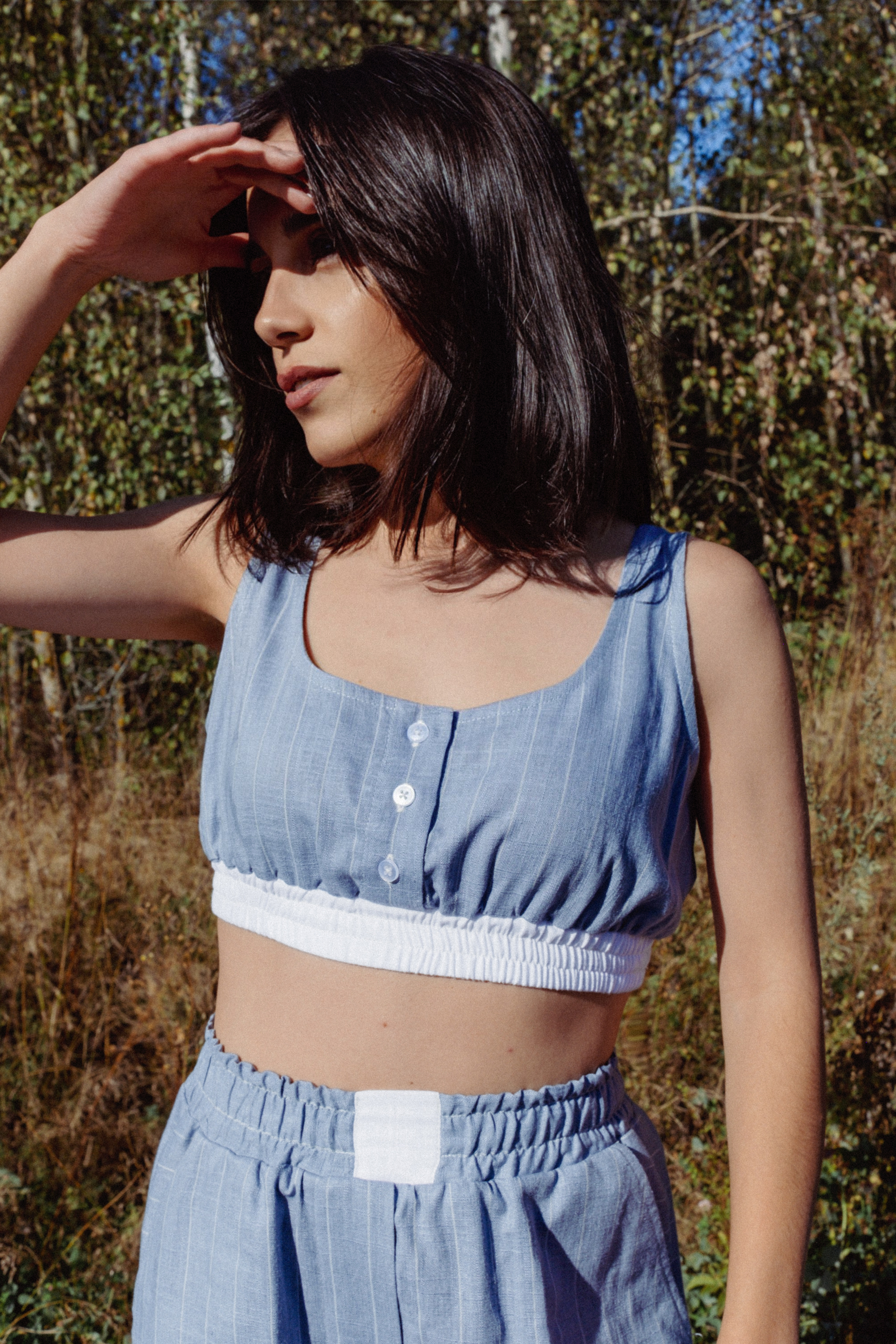 Топ из полульняной ткани. Глубокий вырез горловины круглой формы. Застёжка спереди на 3 петли и пуговицы. Горловина и проймы обработаны косой бейкой. По нижнему краю притачной пояс из ткани – компаньона с широкой резинкой, простроченной двумя строчками.