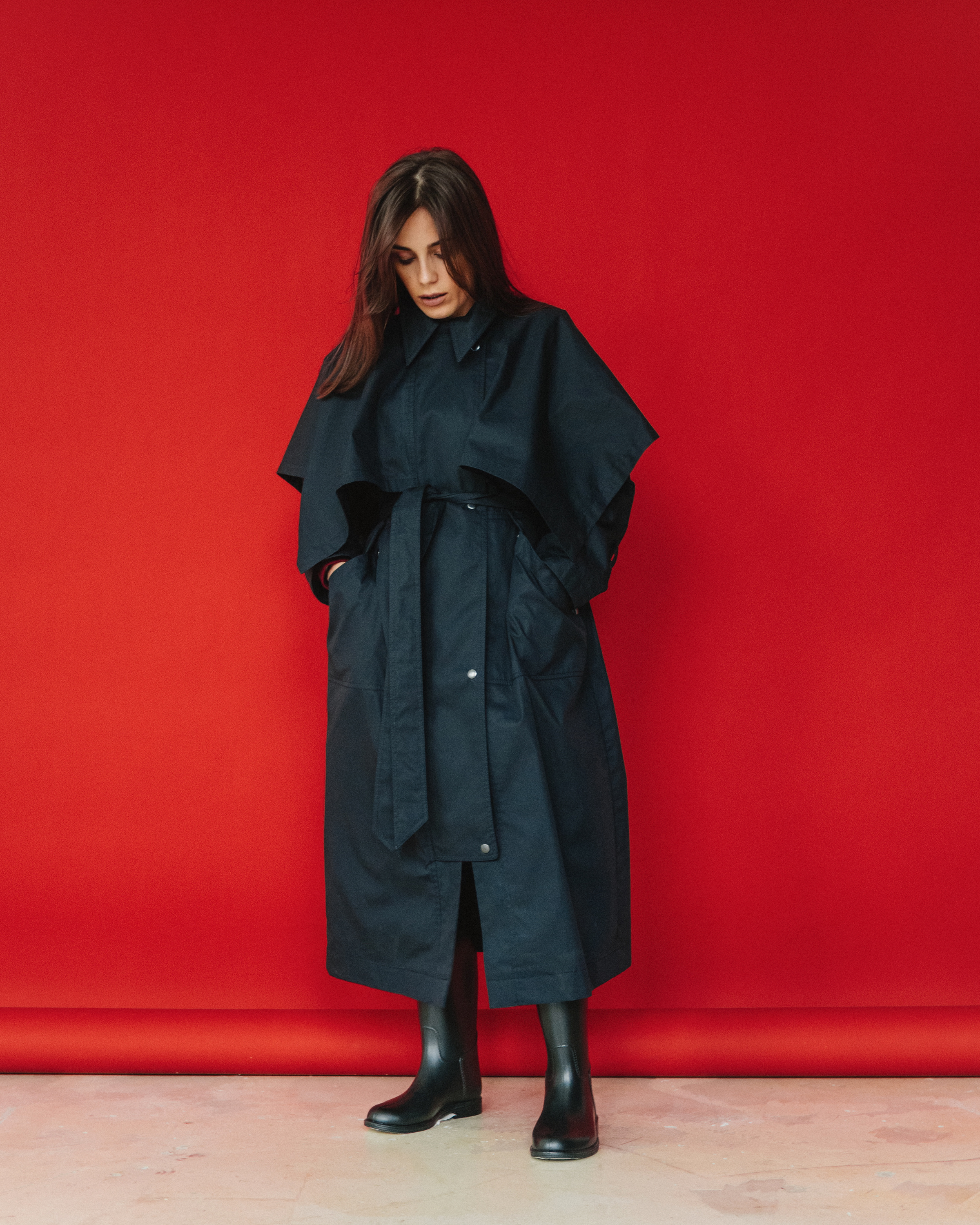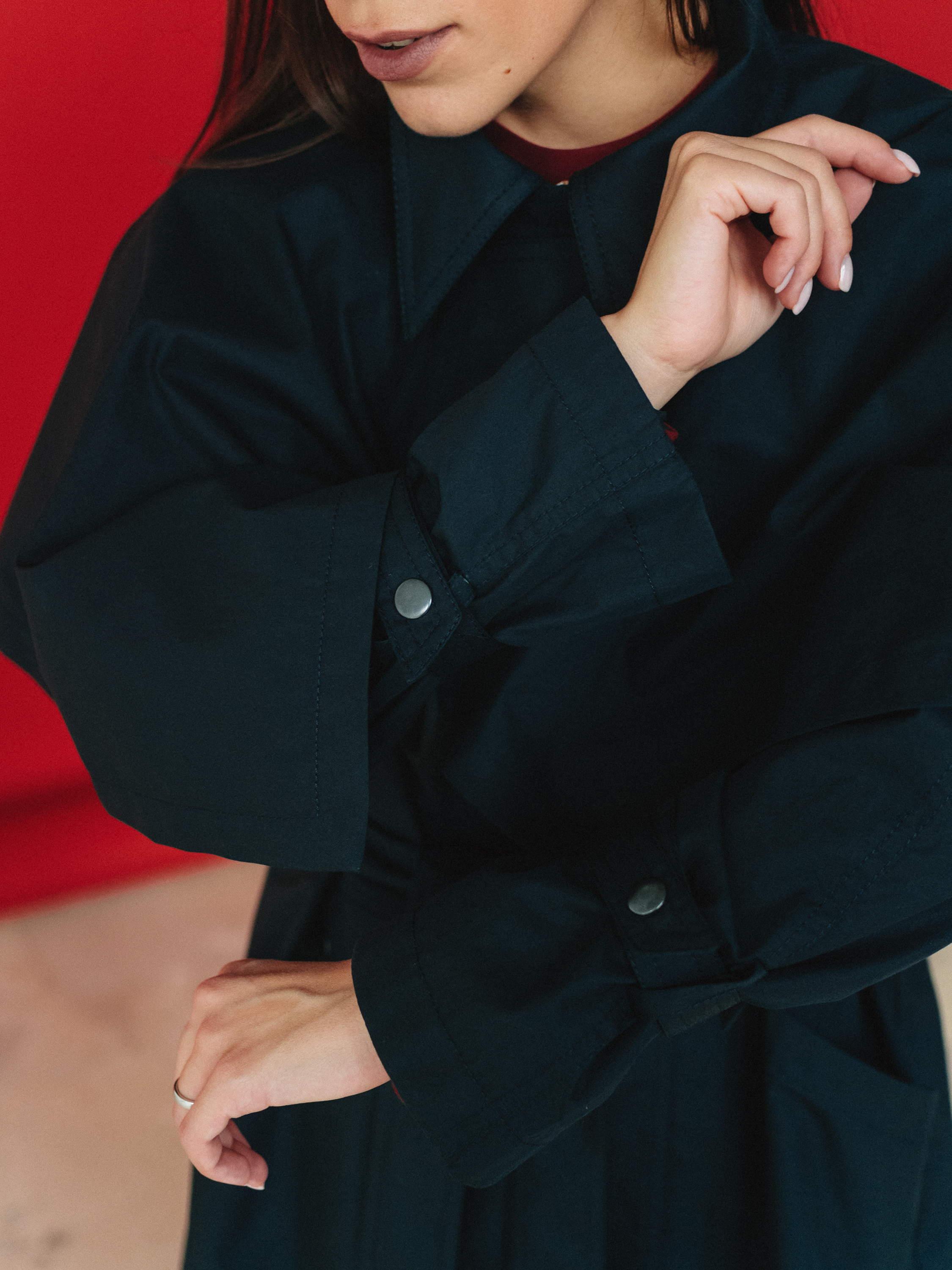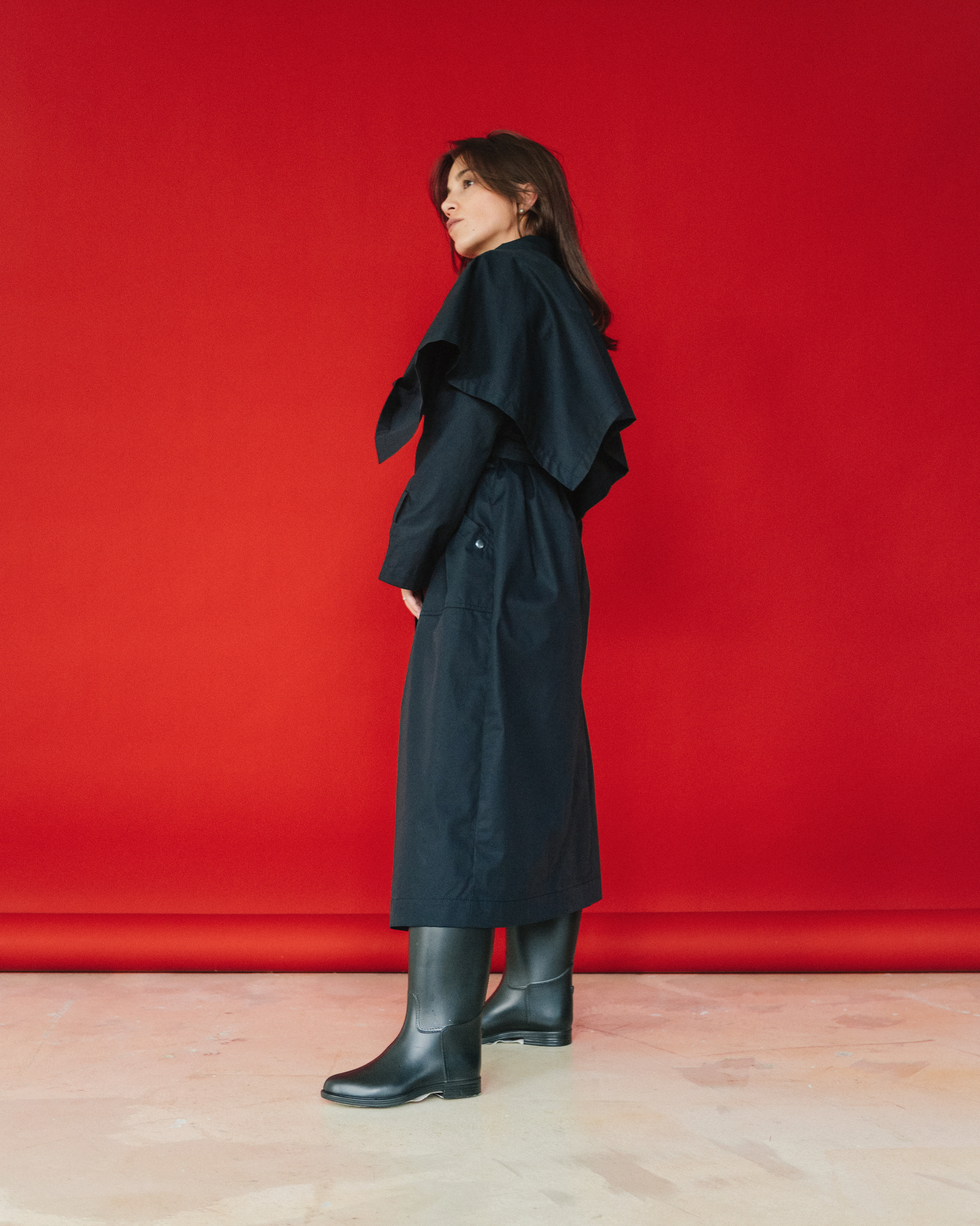 Тренч прямого силуэта покроя реглан с отлетной пелериной. Воротник рубашечный с декоративной патой. Застегивается плащ на молнию, которая закрывается широкой планкой, застегивающейся на кнопки. Пелерина имеет форму прямоугольника и втачивается по горловине и в шов притачивания планки. Карманы накладные с декоративными кнопками и отстрочкой. По низу рукавов расположены шлевки со съемными хлястиками. Линия талии подчеркивается поясом. Частичная подкладка по спинке.