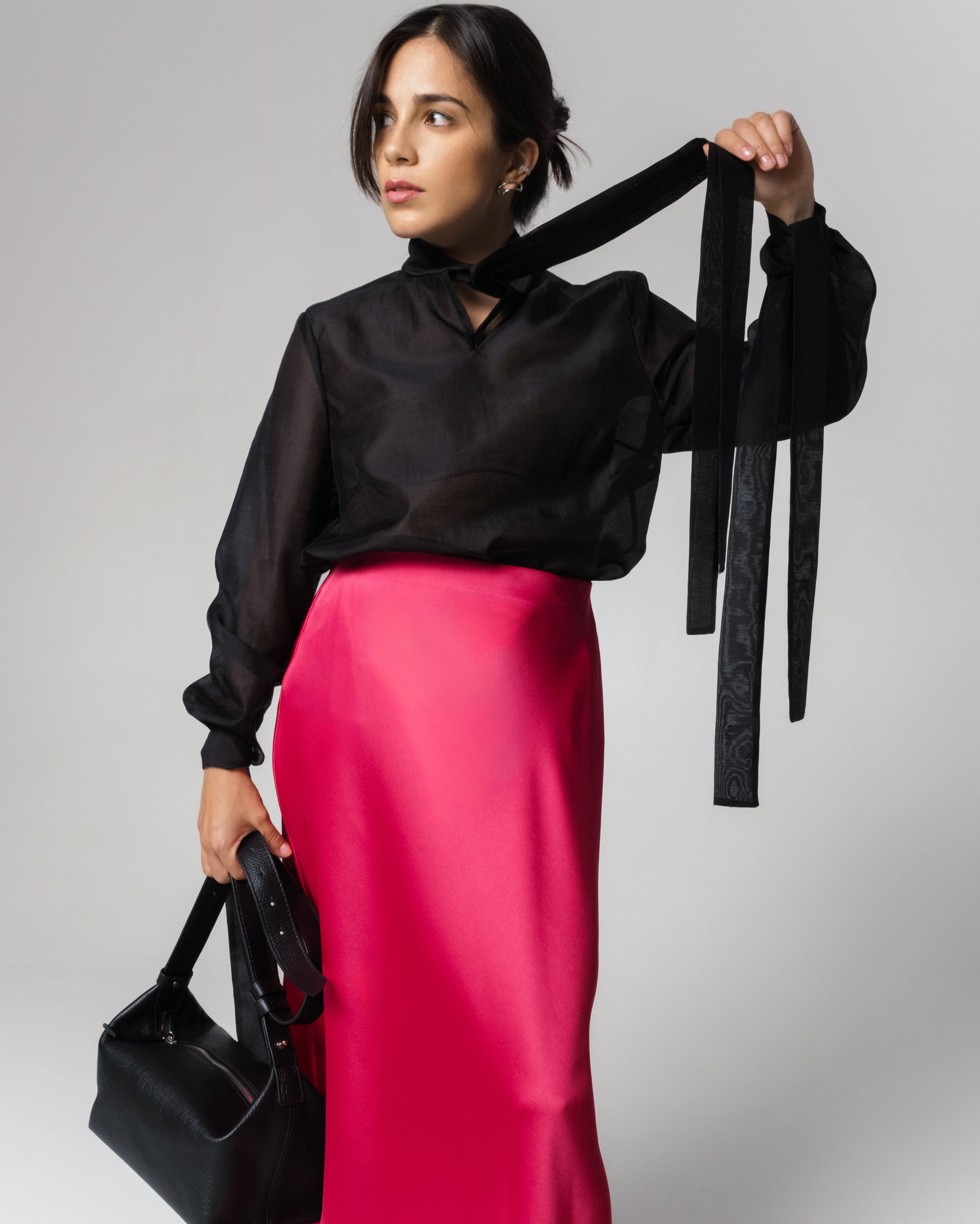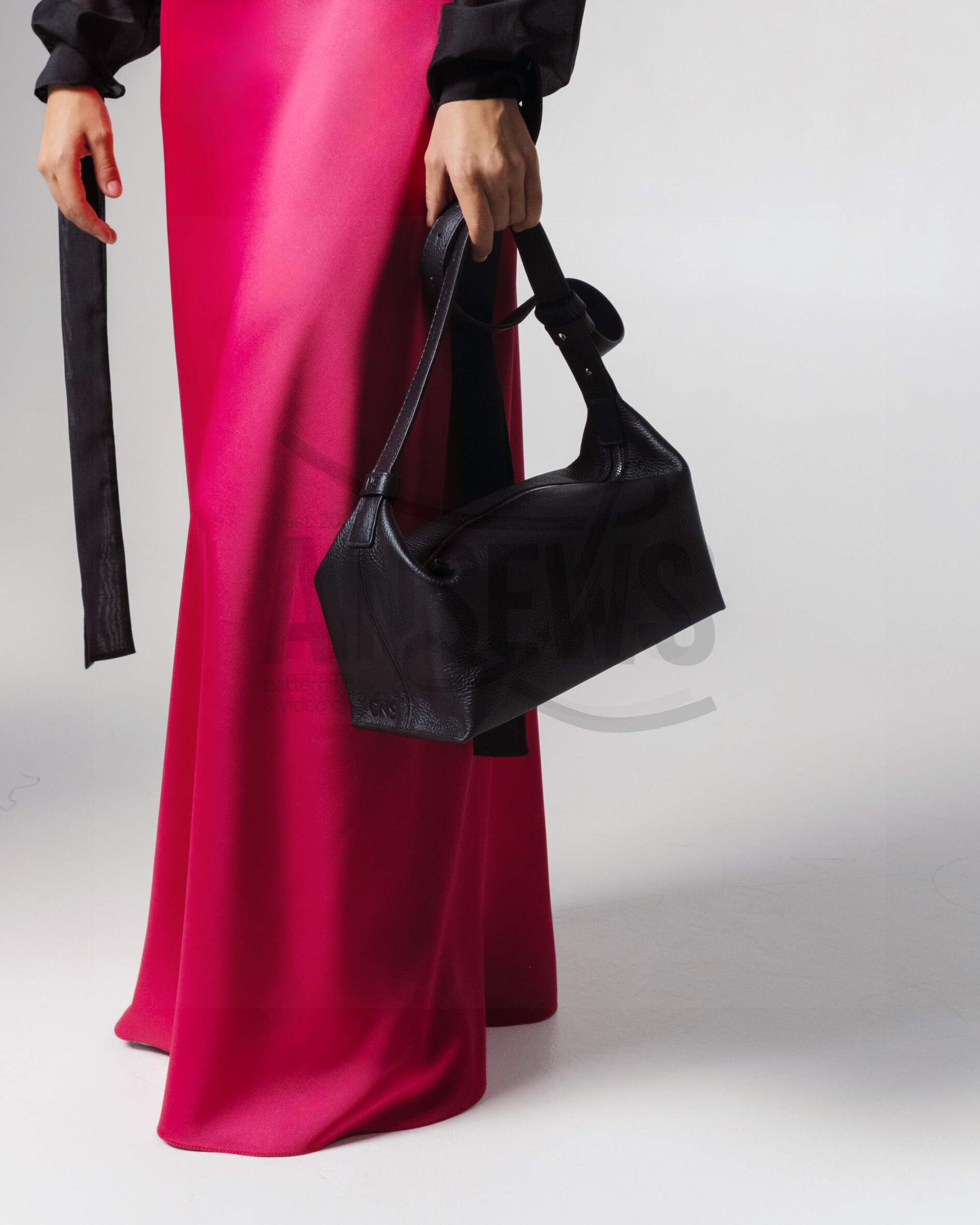 Юбка А-силуэта, выкроенная по косой нити. Верх юбки обработан внутренней широкой резинкой. Надевать юбку следует через голову ввиду малого объеме по талии.