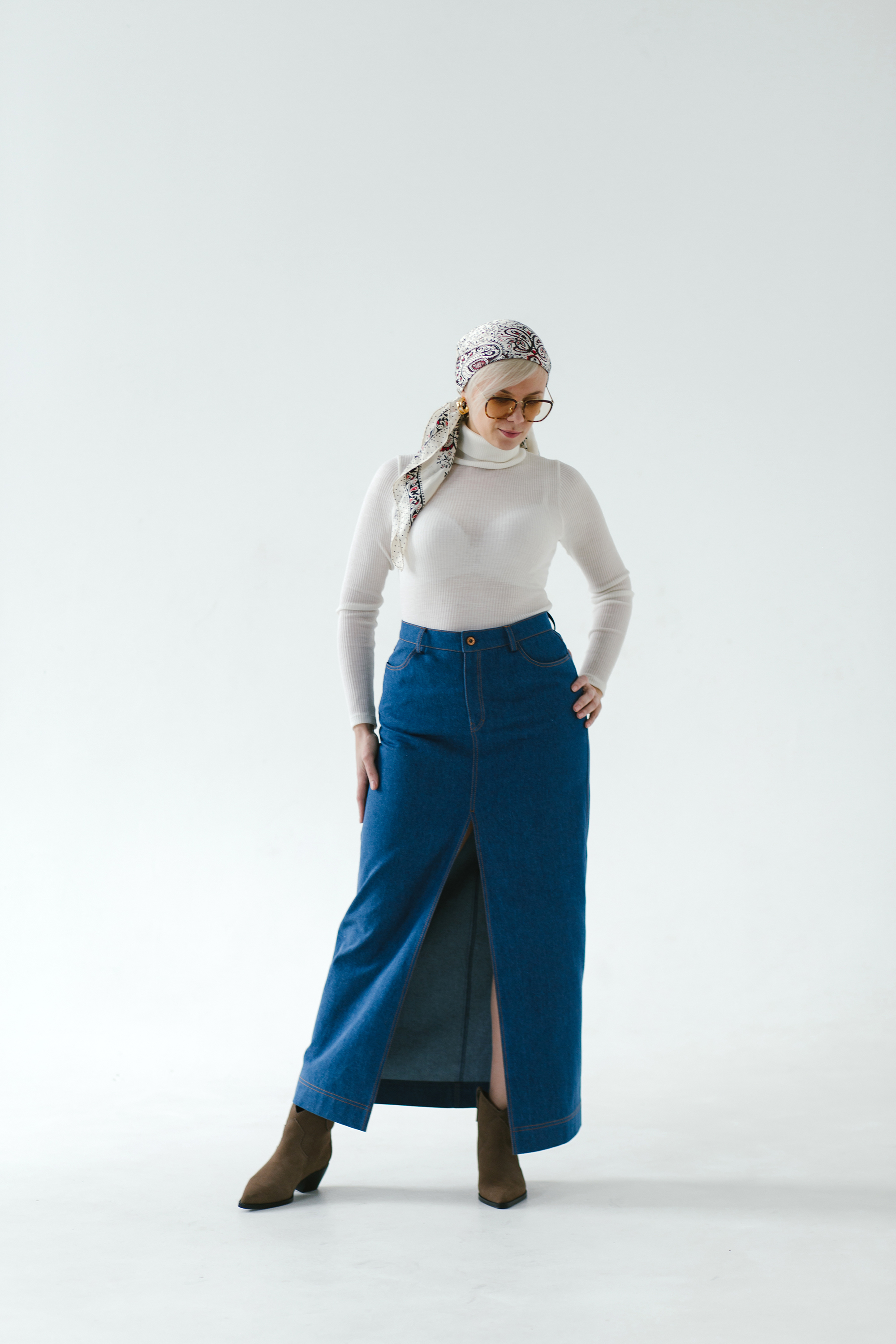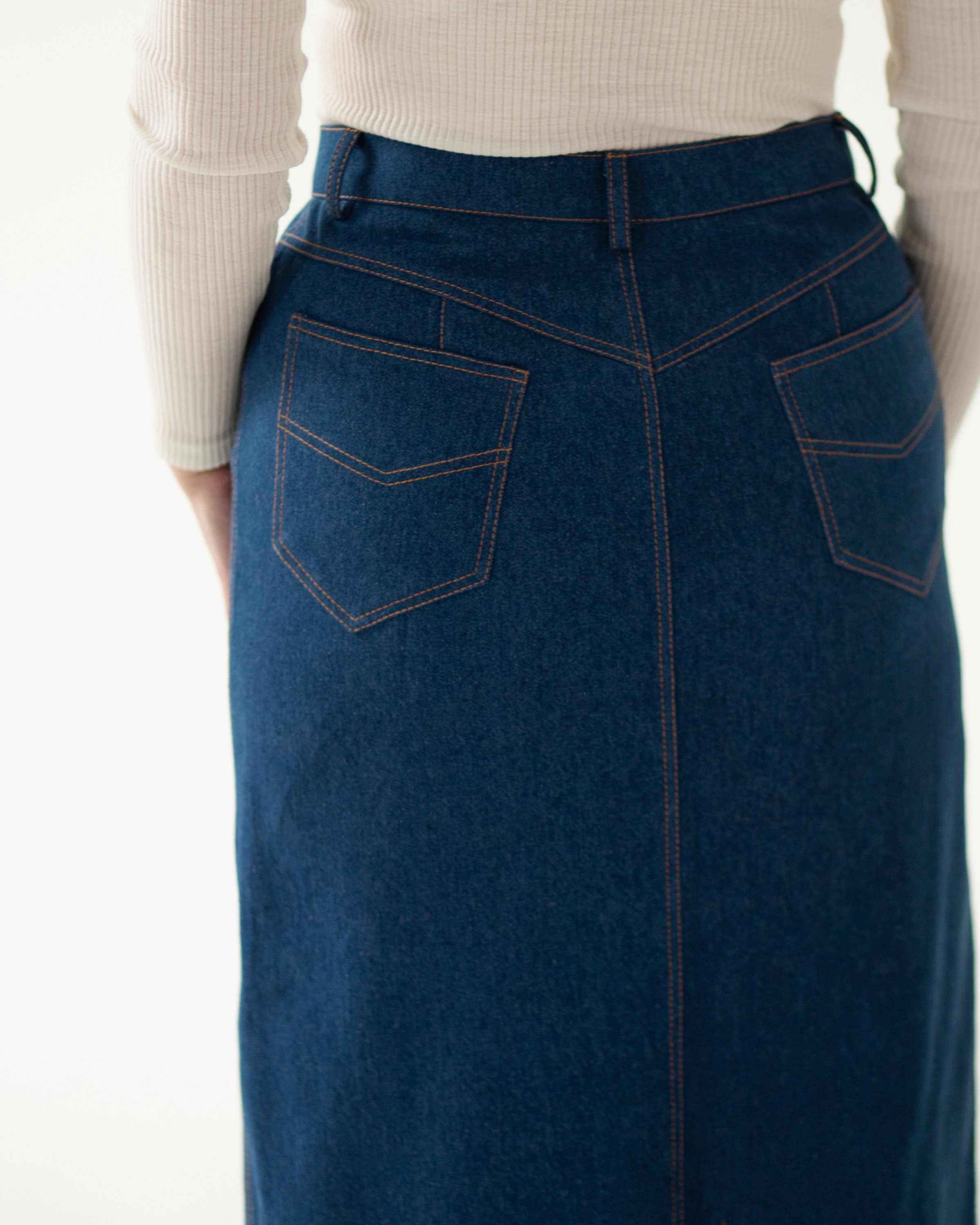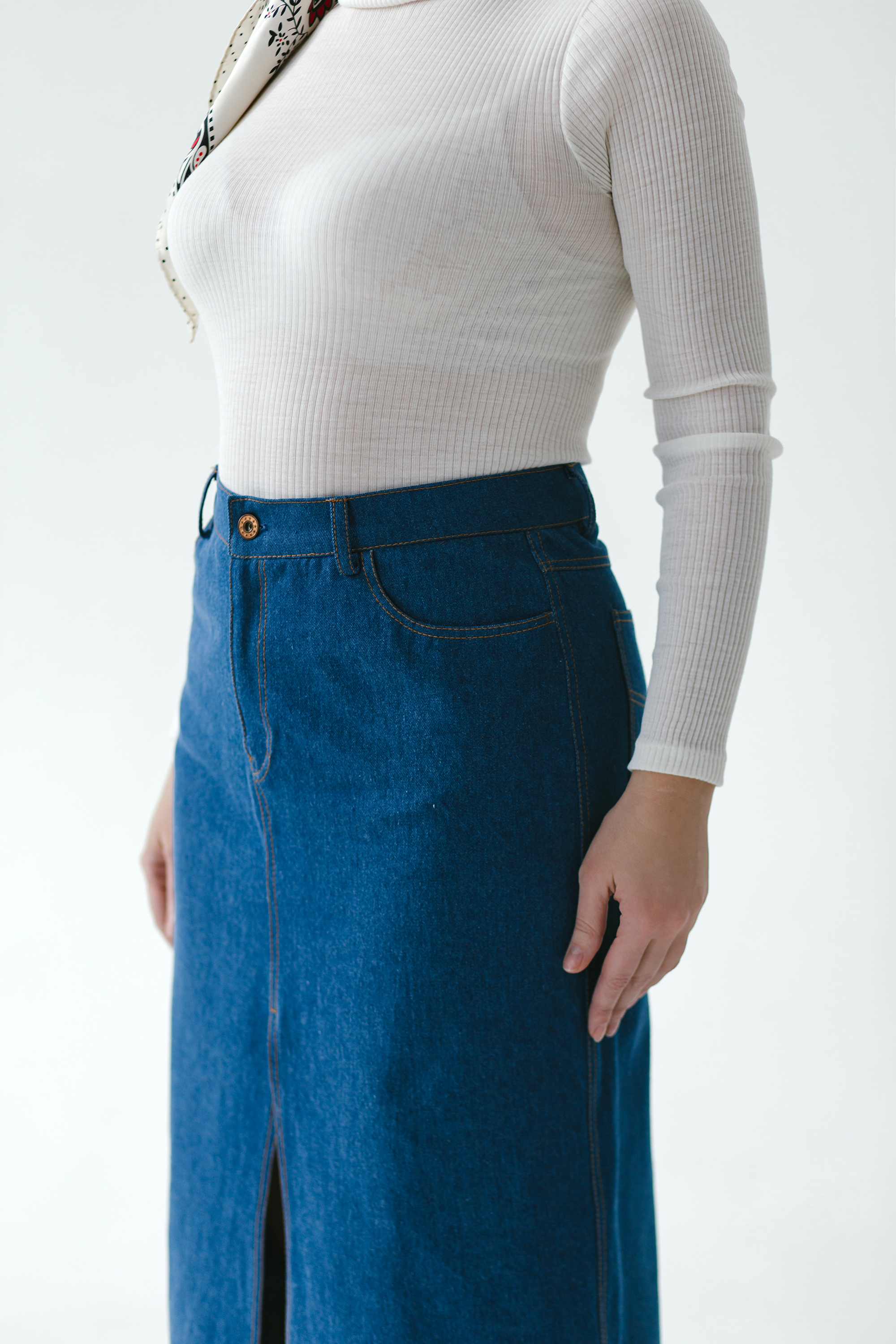 Юбка из джинсовой ткани прямого силуэта длинной до щиколотки. Линия талии на естественном месте, пояс застегивается на пуговицу, на поясе пять шлевок под ремень. Застежка –молния в среднем шве переда оформлена брючным гульфиком с двойными отделочными строчками. Карманы боковые классические джинсовые. В среднем шве переда разрез-шлица отстрочена двойными отделочными строчками.