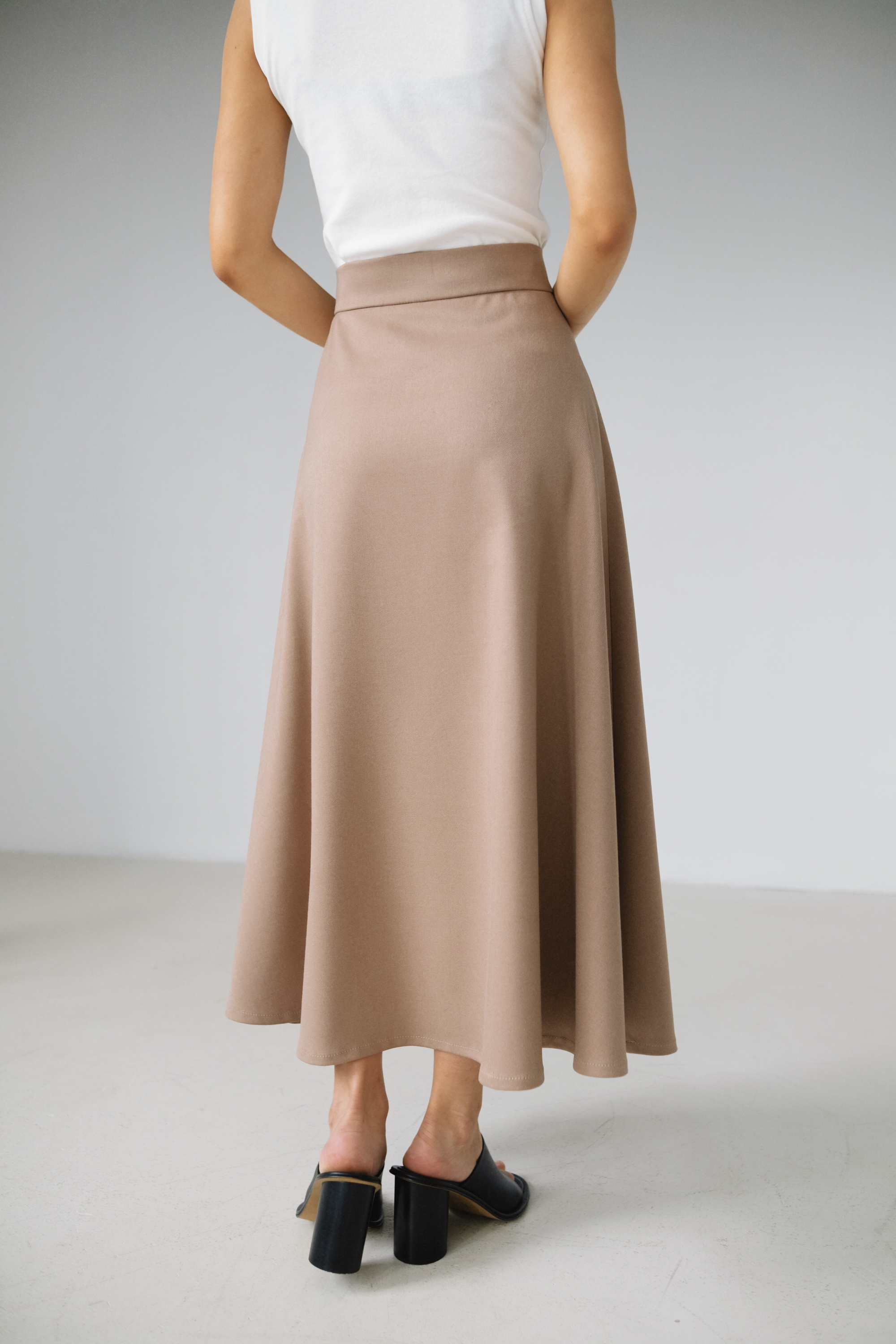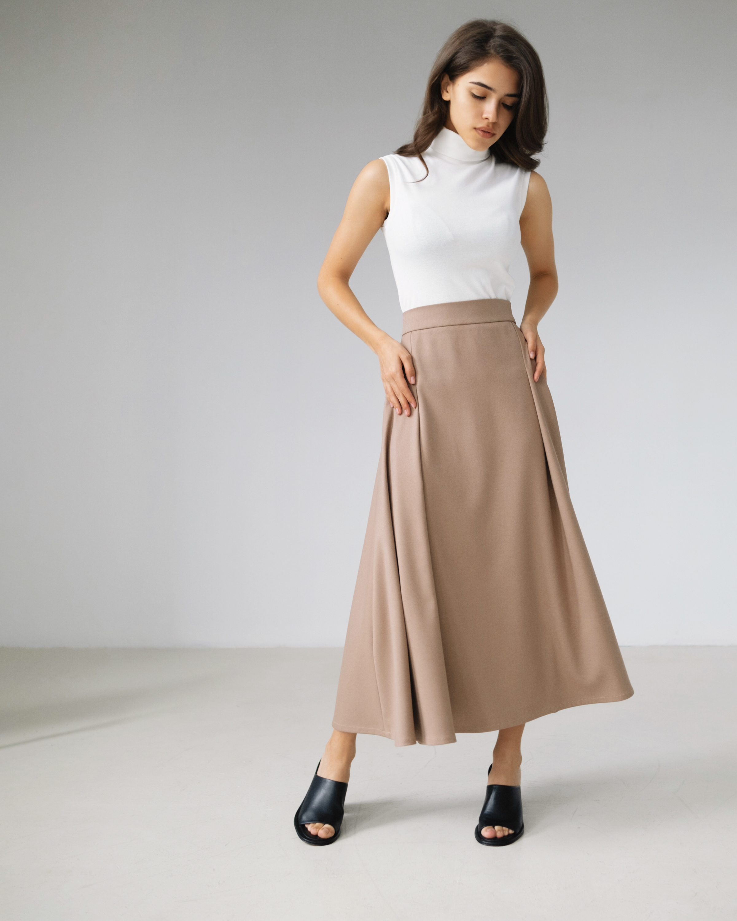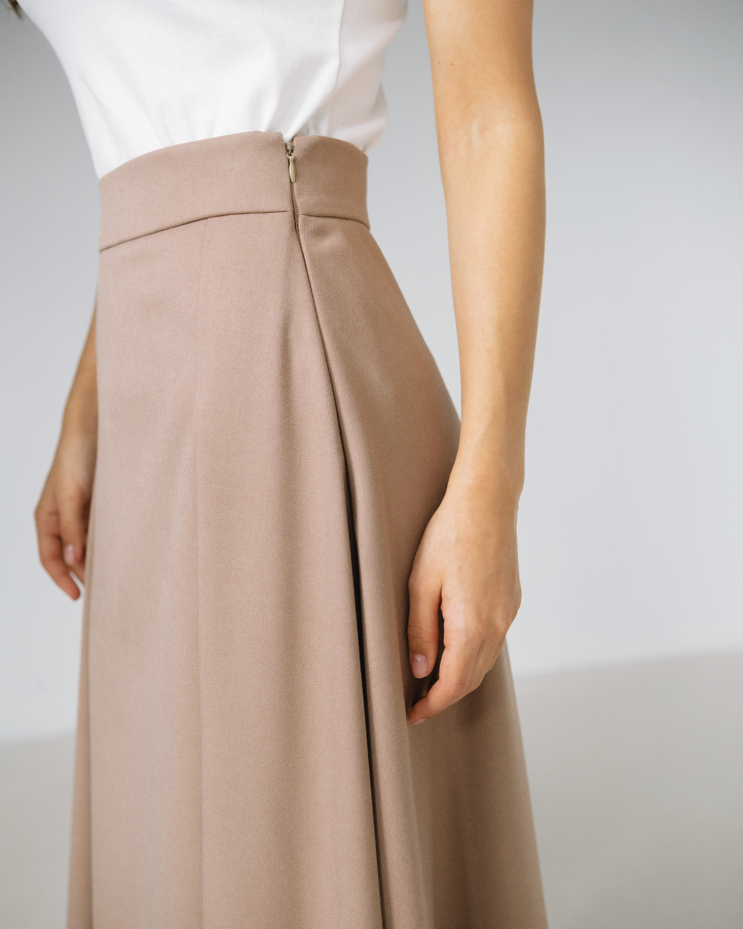 Юбка из костюмной ткани А-силуэта. Пояс притачной. Застежка на потайную молнию в левом боковом шве. На переднем полотнище расположены 2 встречные наклонные глубокие мягкие складки.