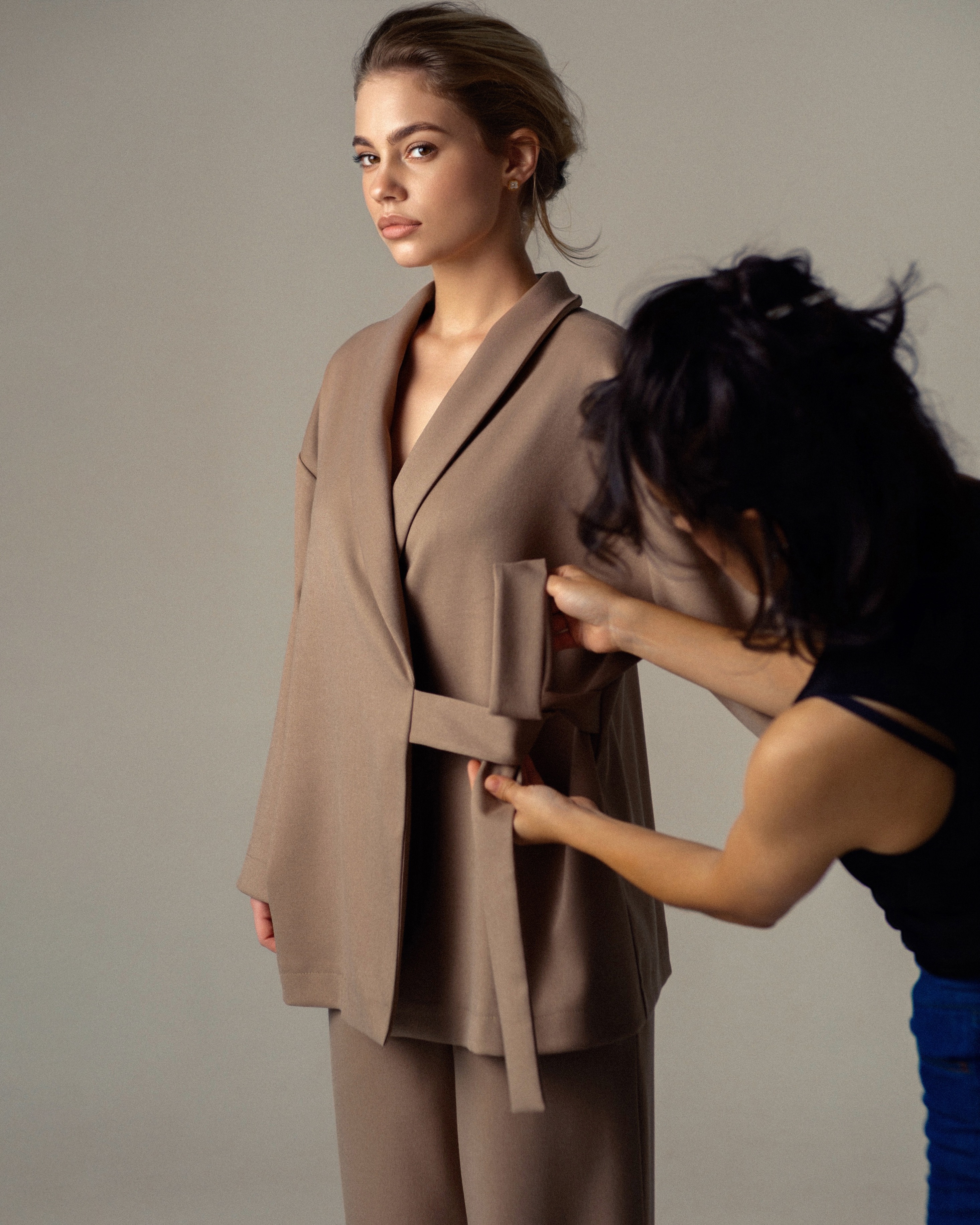 Жакет на запах умеренного объема, прямого силуэта, из костюмной ткани. Линия проймы спущена, рукав длинный, рубашечный. Шалевый воротник. Жакет фиксируется двумя поясами, притачанными к борту полочки и в боковом шве, и двумя внутренними завязками. Жакет без подкладки. Длина жакета ниже линии бедер.