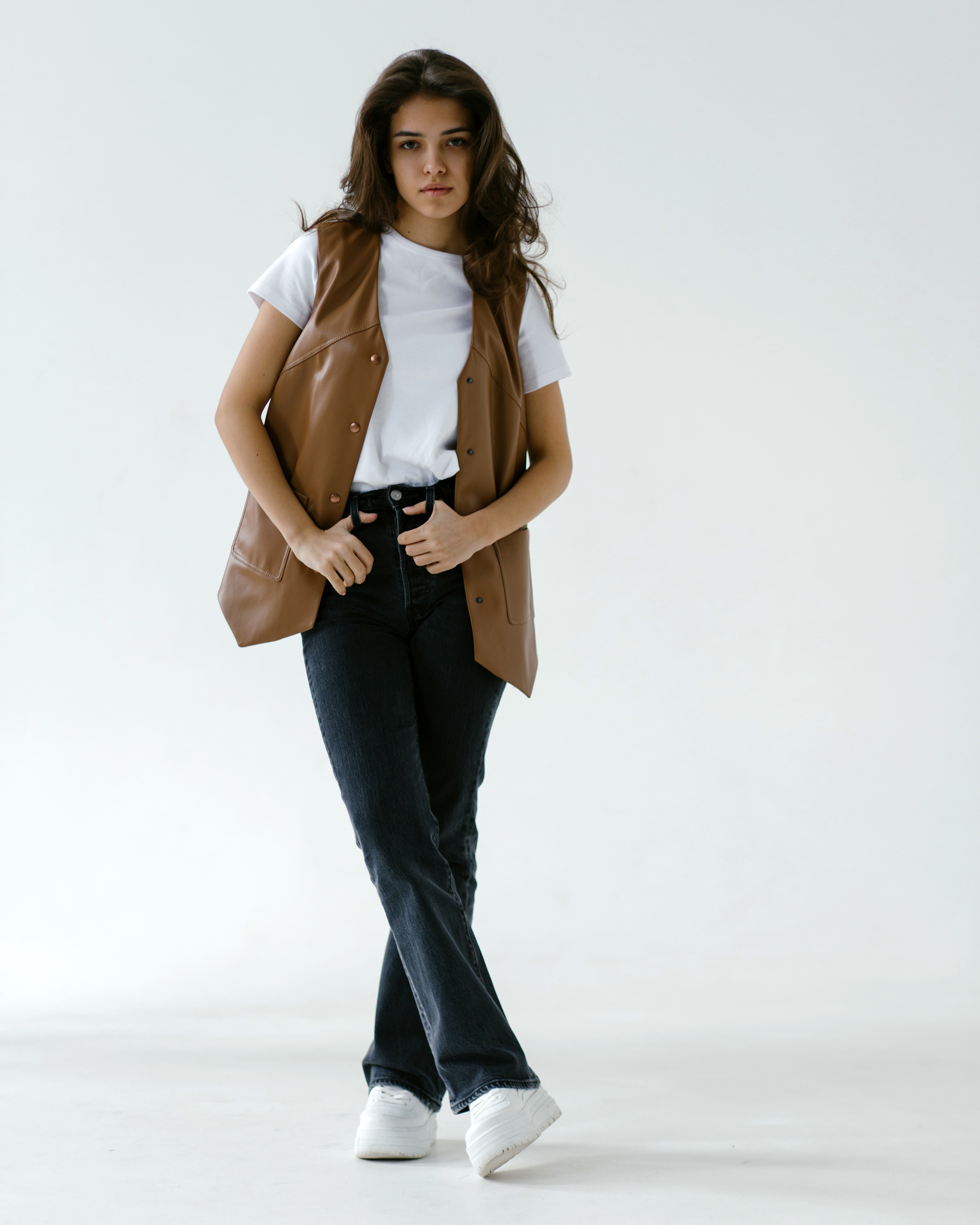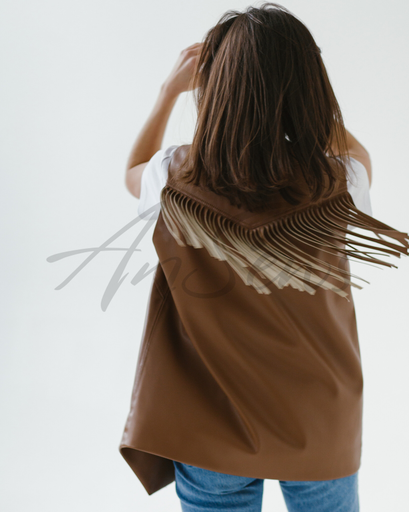 Жилет оверсайз из экокожи прямого силуэта на подкладке. Горловина V-образной формы. Полочки с кокетками и накладными карманами. Застежка на металлические кнопки. Линия низа полочек фигурная. Кокетка спинки отделана бахромой. Кокетки полочек и спинки отстрочены двойной отделочной строчкой.