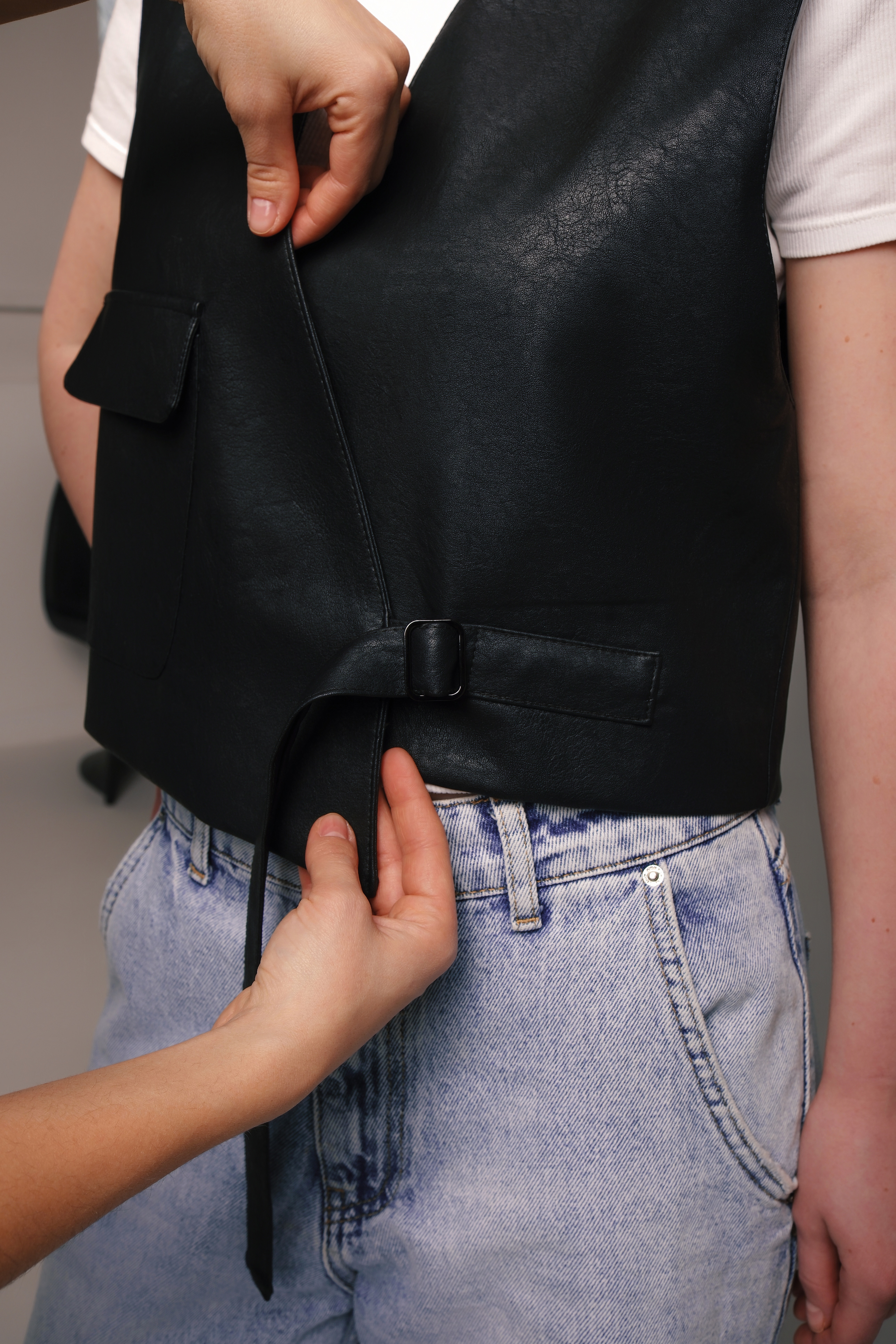 низа спереди с асимметричной застежкой на ремешок и пряжку. На правой полочке