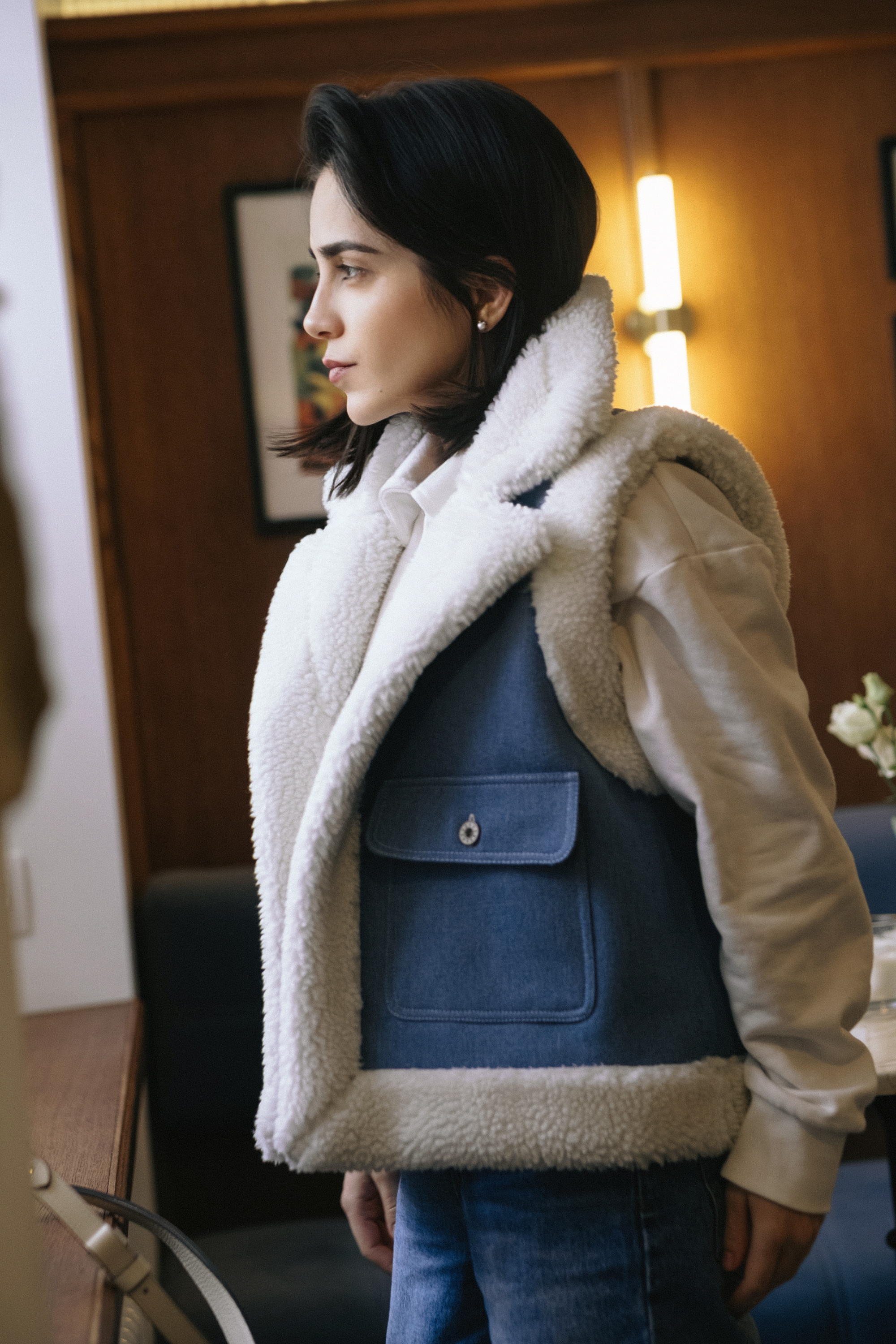 Жилет прямого силуэта, умеренного объема из двухсторонней двухслойной дубленки. Проймы, борта и низ изделия обработаны меховой оторочкой. Воротник английский. Накладные карманы с клапанами, с застежкой на прорезную петлю и пуговицу.
