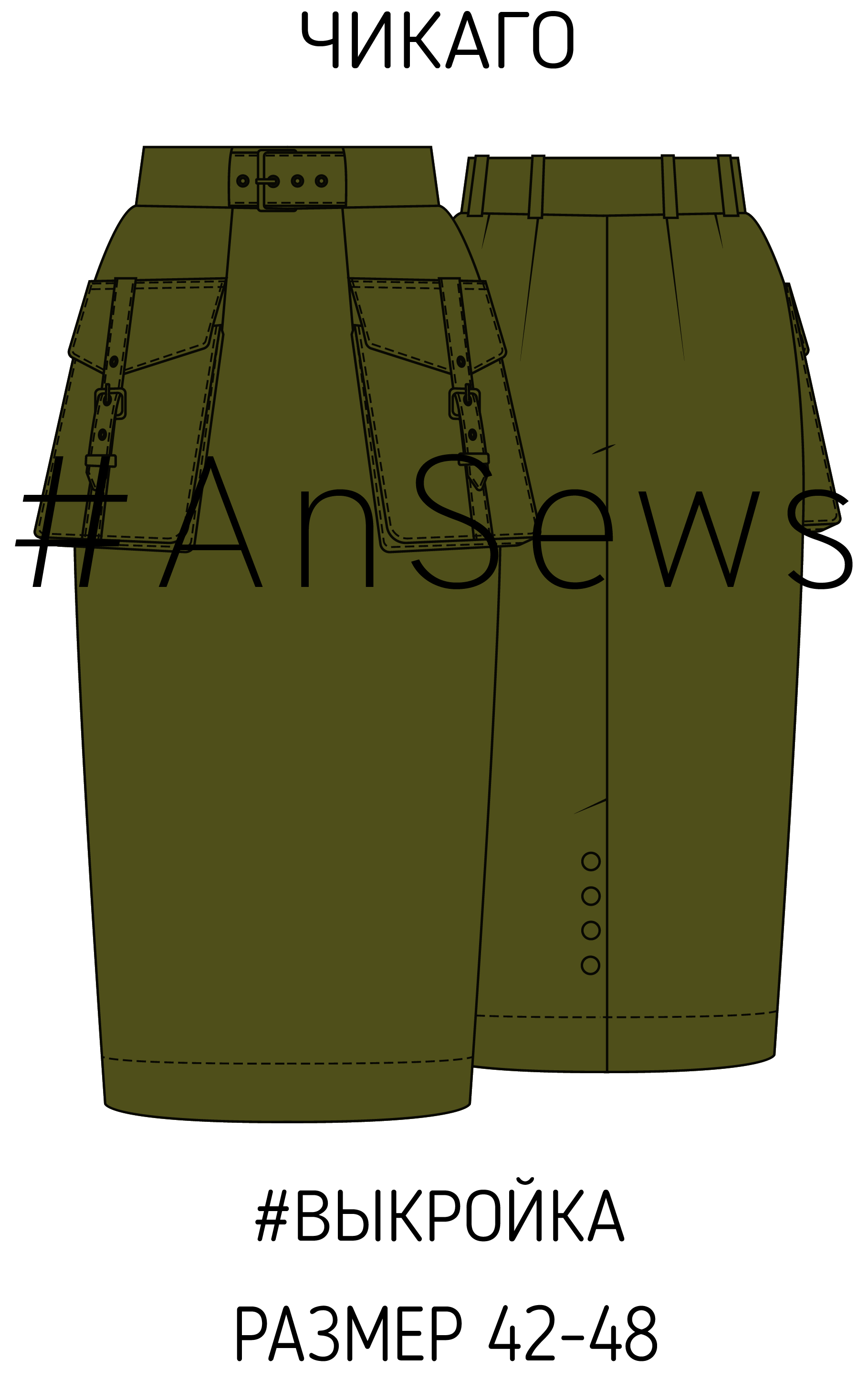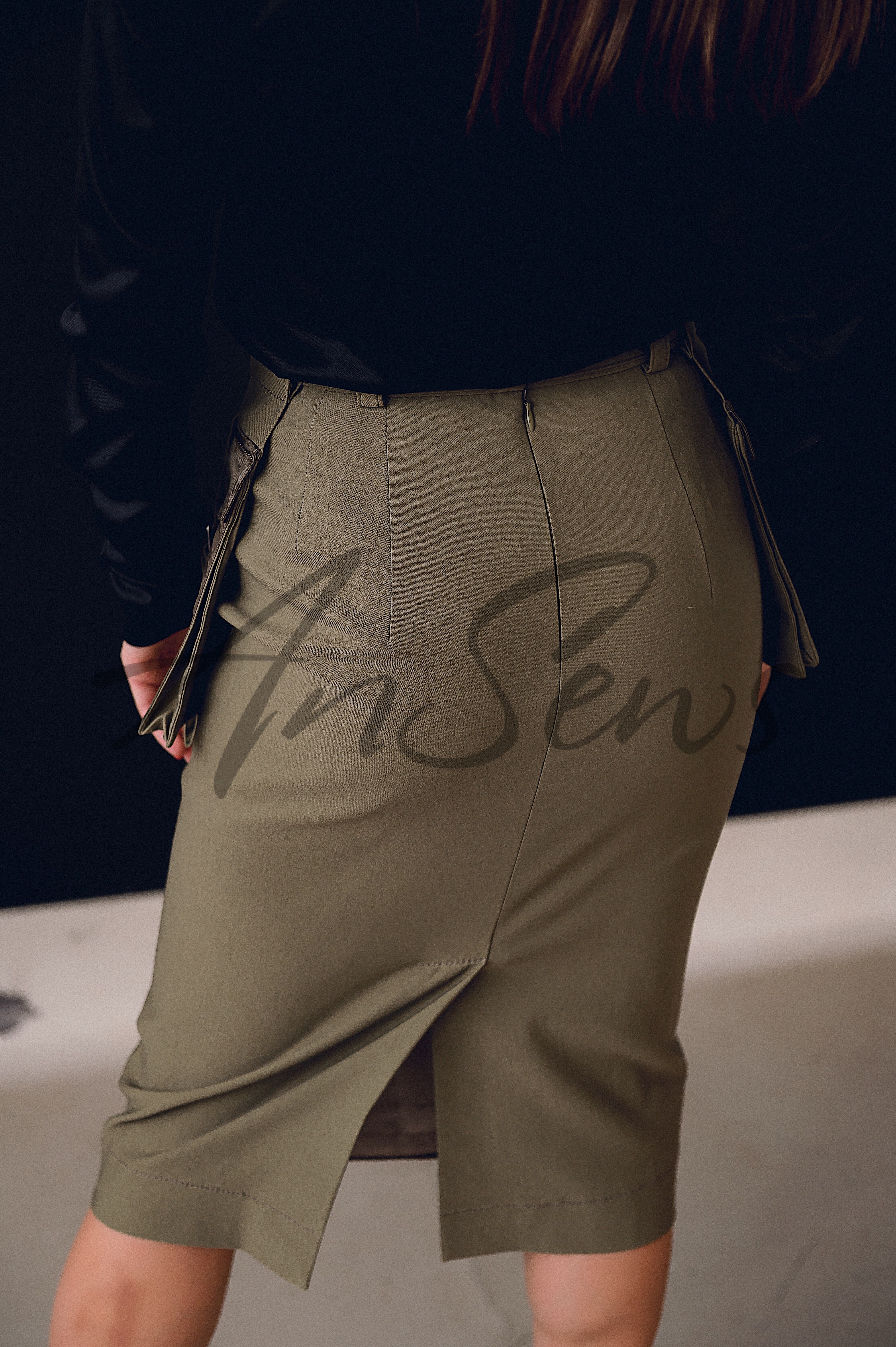 Юбка-карандаш на притачном поясе, облегающая по бедрам, зауженная к низу, на подкладке. В заднем среднем шве расположена шлица. Застежка на потайную молнию в заднем среднем шве и кнопку на поясе. К юбке прилагается ремень с пряжкой со съемными карманами вида «портфель». Застежки на карманах выполнены на пряжках с люверсами.